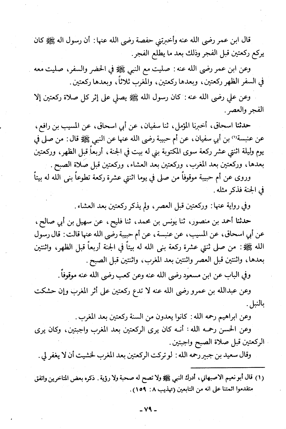 حَدَّثَنَا أَحْمَدُ بْنُ مَنْصُورٍ، ثنا يُونُسُ بْنُ مُحَمَّدٍ، ثنا فُلَيْحٌ، عَنْ سُهَيْلِ بْنِ أَبِي صَالِحٍ، عَنْ أَبِي إِسْحَاقَ، عَنِ الْمُسَيَّبِ، عَنْ عَنْبَسَةَ، عَنْ أُمِّ حَبِيبَةَ، رَضِيَ اللَّهُ عَنْهَا قَالَتْ: قَالَ رَسُولُ اللَّهِ صَلَّى اللَّهُ عَلَيْهِ وَسَلَّمَ: " §مَنْ صَلَّى ثِنْتَيْ عَشْرَةَ رَكْعَةً بَنَى اللَّهُ لَهُ بَيْتًا فِي الْجَنَّةِ: أَرْبَعًا قَبْلَ الظُّهْرِ، وَاثْنَتَيْنِ بَعْدَهَا، وَاثْنَتَيْنِ قَبْلَ الْعَصْرِ وَاثْنَتَيْنِ بَعْدَ الْمَغْرِبِ، وَاثْنَتَيْنِ قَبْلَ الصُّبْحِ " وَفِي الْبَابِ عَنِ ابْنِ مَسْعُودٍ رَضِيَ اللَّهُ عَنْهُ وَعَنْ كَعْبٍ رَضِيَ اللَّهُ عَنْهُ مَوْقُوفًا وَعَنْ عَبْدِ اللَّهِ بْنِ عَمْرٍو رَضِيَ اللَّهُ عَنْهُ: «لَا تَدَعْ رَكْعَتَيْنِ عَلَى أَثَرِ الْمَغْرِبِ وَإِنْ حُشِكْتَ بِالنَّبْلِ» وَعَنْ إِبْرَاهِيمَ رَحِمَهُ اللَّهُ: «كَانُوا يَعُدُّونَ مِنَ السُّنَّةِ رَكْعَتَيْنِ بَعْدَ الْمَغْرِبِ» وَعَنِ الْحَسَنِ رَحِمَهُ اللَّهُ: «أَنَّهُ كَانَ يَرَى الرَّكْعَتَيْنِ بَعْدَ الْمَغْرِبِ وَاجِبَتَيْنِ، وَكَانَ يَرَى الرَّكْعَتَيْنِ قَبْلَ صَلَاةِ الصُّبْحِ وَاجِبَتَيْنِ» وَقَالَ سَعِيدُ بْنُ جُبَيْرٍ رَحِمَهُ اللَّهُ: «لَوْ تَرَكْتُ الرَّكْعَتَيْنِ بَعْدَ الْمَغْرِبِ لَخَشِيتُ أَنْ لَا يُغْفَرَ لِي»