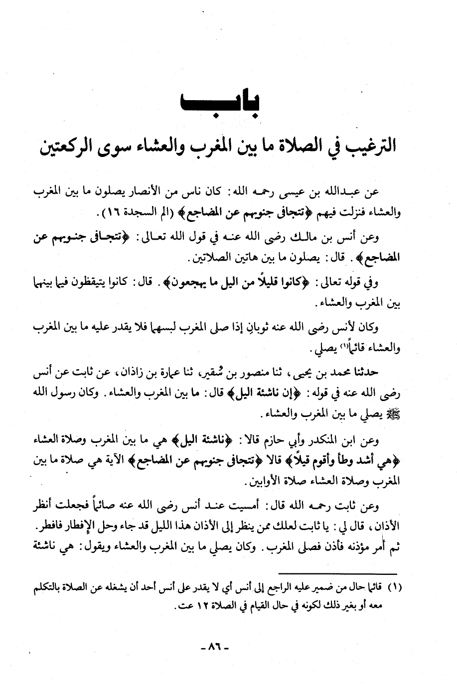 §بَابُ التَّرْغِيبِ فِي الصَّلَاةِ مَا بَيْنَ الْمَغْرِبِ وَالْعِشَاءِ سِوَى الرَّكْعَتَيْنِ عَنْ عَبْدِ اللَّهِ بْنِ عِيسَى رَحِمَهُ اللَّهُ: " كَانَ نَاسٌ مِنَ الْأَنْصَارِ يُصَلُّونَ مَا بَيْنَ الْمَغْرِبِ وَالْعِشَاءِ فَنَزَلَتْ فِيهِمْ {تَتَجَافَى جُنُوبُهُمْ عَنِ الْمَضَاجِعِ} [السجدة: 16] " وَعَنْ أَنَسِ بْنِ مَالِكٍ رَضِيَ اللَّهُ عَنْهُ فِي قَوْلِ اللَّهِ تَعَالَى: {تَتَجَافَى جُنُوبُهُمْ عَنِ الْمَضَاجِعِ} [السجدة: 16]، قَالَ: «يُصَلُّونَ مَا بَيْنَ هَاتَيْنِ الصَّلَاتَيْنِ» وَفِي قَوْلُهُ تَعَالَى: {كَانُوا قَلِيلًا مِنَ اللَّيْلِ مَا يَهْجَعُونَ} [الذاريات: 17]، قَالَ: «كَانُوا يَتَيَقَّظُونَ فِيمَا بَيْنَهُمْ بَيْنَ الْمَغْرِبِ وَالْعِشَاءِ» وَكَانَ لِأَنَسٍ رَضِيَ اللَّهُ عَنْهُ ثَوْبَانِ إِذَا صَلَّى الْمَغْرِبَ لَبِسَهُمَا فَلَا يُقْدَرُ عَلَيْهِ مَا بَيْنَ الْمَغْرِبِ وَالْعِشَاءِ قَائِمًا يُصَلِّي