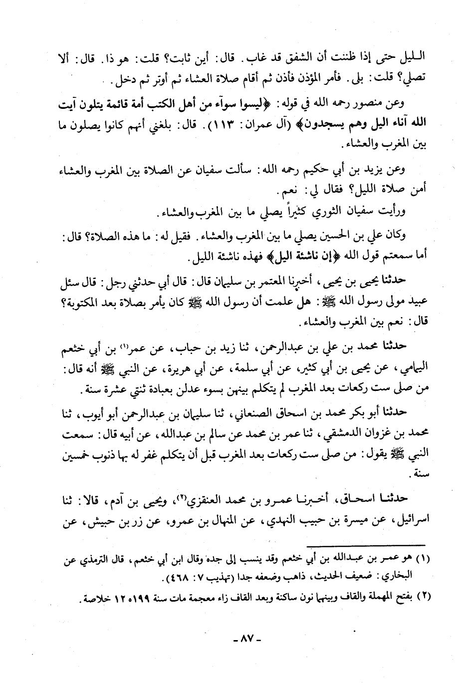 حَدَّثَنَا مُحَمَّدُ بْنُ عَلِيِّ بْنِ عَبْدِ الرَّحْمَنِ، ثنا زَيْدُ بْنُ حُبَابٍ، عَنْ عُمَرَ بْنِ أَبِي خَثْعَمٍ الْيَمَامِيِّ، عَنْ يَحْيَى بْنِ أَبِي كَثِيرٍ، عَنْ أَبِي سَلَمَةَ، عَنْ أَبِي هُرَيْرَةَ، عَنِ النَّبِيِّ صَلَّى اللَّهُ عَلَيْهِ وَسَلَّمَ أَنَّهُ قَالَ: «§مَنْ صَلَّى سِتَّ رَكَعَاتٍ بَعْدَ الْمَغْرِبِ لَمْ يَتَكَلَّمْ بَيْنَهُنَّ بِسُوءٍ عُدِلْنَ بعَبَادَةِ ثِنْتَيْ عَشْرَةَ سَنَةً»