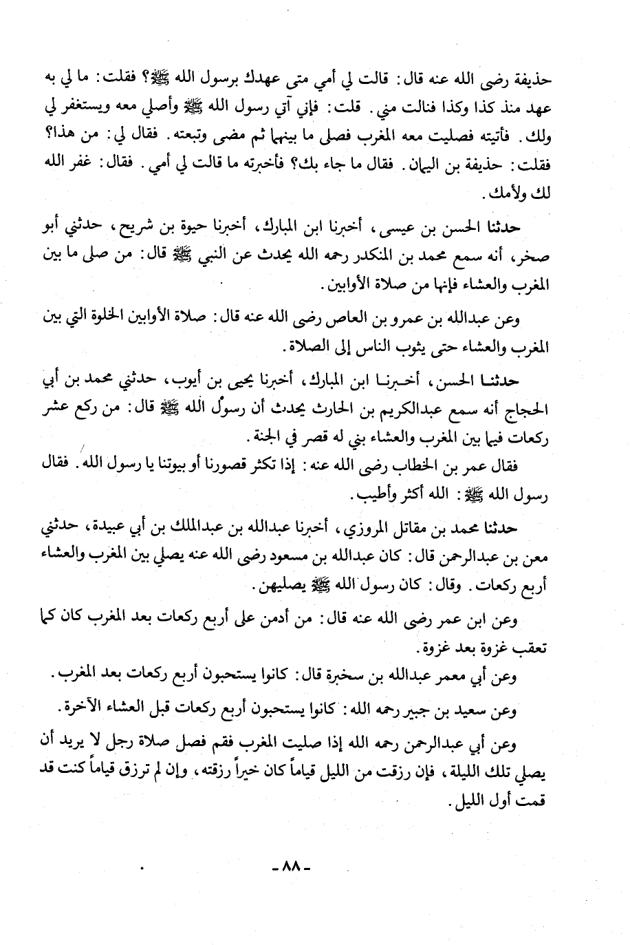 حَدَّثَنَا مُحَمَّدُ بْنُ مُقَاتِلٍ الْمَرْوَزِيُّ، أَخْبَرَنَا عَبْدُ اللَّهِ بْنُ عَبْدِ الْمَلِكِ بْنِ أَبِي عُبَيْدَةَ، حَدَّثَنِي مَعْنُ بْنُ عَبْدِ الرَّحْمَنِ، قَالَ: كَانَ عَبْدُ اللَّهِ بْنُ مَسْعُودٍ رَضِيَ اللَّهُ عَنْهُ §يُصَلِّي بَيْنَ الْمَغْرِبِ وَالْعِشَاءِ أَرْبَعَ رَكَعَاتٍ، وَقَالَ: كَانَ رَسُولُ اللَّهِ صَلَّى اللَّهُ عَلَيْهِ وَسَلَّمَ يُصَلِّيهِنَّ " وَعَنِ ابْنِ عُمَرَ رَضِيَ اللَّهُ عَنْهُ قَالَ: «مَنْ أَدْمَنَ عَلَى أَرْبَعِ رَكَعَاتٍ بَعْدَ الْمَغْرِبِ كَانَ كَمَا تَعَقَّبَ غَزْوَةً بَعْدَ غَزْوَةٍ» وَعَنْ أَبِي مَعْمَرٍ عَبْدِ اللَّهِ بْنِ سَخْبَرَةَ قَالَ: «كَانُوا يَسْتَحِبُّونَ أَرْبَعَ رَكَعَاتٍ بَعْدَ الْمَغْرِبِ» وَعَنْ سَعِيدِ بْنِ جُبَيْرٍ رَحِمَهُ اللَّهُ: «كَانُوا يَسْتَحِبُّونَ أَرْبَعَ رَكَعَاتٍ قَبْلَ الْعِشَاءِ الْآخِرَةِ» وَعَنْ أَبِي عَبْدِ الرَّحْمَنِ رَحِمَهُ اللَّهُ «إِذَا صَلَّيْتَ الْمَغْرِبَ فَقُمْ فَصَلِّ صَلَاةَ رَجُلٍ لَا يُرِيدُ أَنْ يُصَلِّيَ تِلْكَ اللَّيْلَةَ، فَإِنْ رُزِقْتَ مِنَ اللَّيْلِ قِيَامًا كَانَ خَيْرًا رُزِقْتَهُ، وَإِنْ لَمْ تُرْزَقْ قِيَامًا كُنْتَ قَدْ قُمْتَ أَوَّلَ اللَّيْلِ»