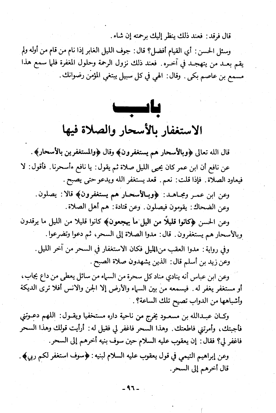 §بَابُ الِاسْتِغْفَارِ بِالْأَسْحَارِ وَالصَّلَاةِ فِيهَا قَالَ اللَّهُ تَعَالَى: {وَبِالْأَسْحَارِ هُمْ يَسْتَغْفِرُونَ} [الذاريات: 18] وَقَالَ: {وَالْمُسْتَغْفِرِينَ بِالْأَسْحَارِ} [آل عمران: 17] عَنْ نَافِعٍ أَنَّ ابْنَ عُمَرَ كَانَ يُحْيِي اللَّيْلَ ثُمَّ يَقُولُ: يَا نَافِعُ أَأَسْحَرْنَا؟، فَأَقُولُ: لَا فَيُعَاوِدُ الصَّلَاةَ، فَإِذَا قُلْتُ: نَعَمْ، قَعَدَ يَسْتَغْفِرُ اللَّهَ وَيَدْعُو حَتَّى يُصْبِحَ " وَعَنِ ابْنِ عُمَرَ وَمُجَاهِدٍ: {وَبِالْأَسْحَارِ هُمْ يَسْتَغْفِرُونَ} [الذاريات: 18] قَالَا: يُصَلُّونَ " وَعَنِ الضَّحَّاكِ: «يَقُومُونَ فَيُصَلُّونَ» وَعَنْ قَتَادَةَ: «هُمْ أَهْلُ الصَّلَاةِ» وَعَنِ الْحَسَنِ " {كَانُوا قَلِيلًا مِنَ اللَّيْلِ مَا يَهْجَعُونَ} [الذاريات: 17]: كَانُوا قَلِيلًا مِنَ اللَّيْلِ مَا يَرْقُدُونَ {وَبِالْأَسْحَارِ هُمْ يَسْتَغْفِرُونَ} [الذاريات: 18] قَالَ: مَدُّوا الصَّلَاةَ إِلَى السَّحَرِ، ثُمَّ دَعُوا وَتَضَرَّعُوا " وَفِي رِوَايَةٍ: «مَدُّوا الْعَقِبَ مِنَ اللَّيْلِ فَكَانَ الِاسْتِغْفَارُ فِي السَّحَرِ مِنْ آخِرِ اللَّيْلِ» وَعَنْ زَيْدِ بْنِ أَسْلَمَ قَالَ: «الَّذِينَ يَشْهَدُونَ صَلَاةَ الصُّبْحِ» وَعَنِ ابْنِ عَبَّاسٍ: «أَنَّهُ يُنَادِي مُنَادٍ كُلَّ سَحَرَةٍ مِنَ السَّمَاءِ مَنْ سَائِلٌ يُعْطَى مَنْ دَاعٍ يُجَابُ، أَوْ مُسْتَغْفِرٌ يُغْفَرُ لَهُ، فَيَسْمَعُهُ مَنْ بَيْنَ السَّمَاءِ وَالْأَرْضِ إِلَّا الْجِنَّ وَالْإِنْسَ، أَفَلَا تَرَى الدِّيَكَةَ وَأَشْبَاهَهَا مِنَ الدَّوَابِّ تَصِيحُ تِلْكَ السَّاعَةَ» وَكَانَ عَبْدُ اللَّهِ بْنُ مَسْعُودٍ يَخْرُجُ مِنْ نَاحِيَةِ دَارِهِ مُسْتَخْفِيًا وَيَقُولُ: " اللَّهُمَّ دَعَوْتَنِي فَأَجَبْتُكَ، وَأَمَرْتَنِي فَأَطَعْتُكَ، وَهَذَا السَّحَرُ فَاغْفِرْ لِي، فَقِيلَ لَهُ: أَرَأَيْتَ قَوْلَكَ: وَهَذَا السَّحَرُ فَاغْفِرْ لِي؟، فَقَالَ: إِنَّ يَعْقُوبَ عَلَيْهِ السَّلَامُ حِينَ سَوَّفَ بَنِيهِ أَخَّرَهُمْ إِلَى السَّحَرِ " وَعَنْ إِبْرَاهِيمَ التَّيْمِيِّ فِي قَوْلِ يَعْقُوبَ عَلَيْهِ السَّلَامُ لَبَيْنَهُ: {سَوْفَ أَسْتَغْفِرُ لَكُمْ رَبِّي} [يوسف: 98] قَالَ: أَخَّرَهُمْ إِلَى السَّحَرِ "