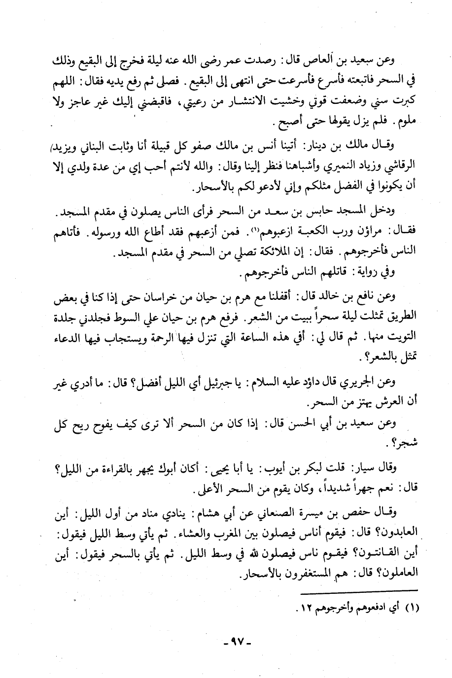 وَعَنْ سَعِيدِ بْنِ الْعَاصِ قَالَ: " رَصَدْتُ عُمَرَ رَضِيَ اللَّهُ عَنْهُ لَيْلَةً فَخَرَجَ إِلَى الْبَقِيعِ وَذَلِكَ فِي السَّحَرِ فَاتَّبَعْتُهُ فَأَسْرَعْتُ حَتَّى انْتَهَى إِلَى الْبَقِيعِ، فَصَلَّى ثُمَّ رَفَعَ يَدَيْهِ فَقَالَ: «اللَّهُمَّ كَبِرَتْ سِنِّي وَضَعُفَتْ قُوَّتِي وَخَشِيتُ الِانْتِشَارَ مِنْ رَعِيَّتِي، فَاقْبِضْنِي إِلَيْكَ غَيْرَ عَاجِزٍ وَلَا مَلُومٍ، فَلَمْ يَزَلْ يَقُولُهَا حَتَّى أَصْبَحَ» وَقَالَ مَالِكُ بْنُ دِينَارٍ: أَتَيْنَا أَنَسَ بْنَ مَالِكٍ صَفْوَ كُلِّ قَبِيلَةٍ، أَنَا وَثَابِتٌ الْبُنَانِيُّ، وَيَزِيدُ الرَّقَاشِيُّ، وَزِيَادٍ النُّمَيْرِيُّ، وَأَشْبَاهُنَا فَنَظَرَ إِلَيْنَا وَقَالَ: «وَاللَّهِ لَأَنْتُمْ أَحَبُّ إِلَيَّ مِنْ عِدَّةِ وَلَدِي إِلَّا أَنْ يَكُونُوا فِي الْفَضْلِ مِثْلَكُمْ وَإِنِّي لَأَدْعُو لَكُمْ بِالْأَسْحَارِ» وَدَخَلَ الْمَسْجِدَ حَابِسُ بْنُ سَعْدٍ مِنَ السَّحَرِ فَرَأَى النَّاسَ يُصَلُّونَ فِي مُقَدَّمِ الْمَسْجِدِ، فَقَالَ: " مُرَاءُونُ وَرَبِّ الْكَعْبَةِ أَزْعِبُوهُمْ، فَمَنْ أَزْعَبَهُمْ فَقَدْ أَطَاعَ اللَّهَ وَرَسُولَهُ، فَأَتَاهُمُ النَّاسُ فَأَخْرَجُوهُمْ، فَقَالَ: إِنَّ الْمَلَائِكَةَ تُصَلِّي مِنَ السَّحَرِ فِي مُقَدَّمِ الْمَسْجِدِ " وَفِي رِوَايَةٍ: قَاتَلَهُمُ النَّاسُ فَأَخْرَجُوهُمْ. وَعَنْ نَافِعِ بْنِ خَالِدٍ قَالَ: أَقْفَلْنَا مَعَ هَرِمِ بْنِ حَيَّانَ مِنْ خُرَاسَانَ حَتَّى إِذَا كُنَّا فِي بَعْضِ الطَّرِيقِ تَمَثَّلَتُ لَيْلَةً سَحَرًا بِبَيْتٍ مِنَ الشَّعْرِ، فَرَفَعَ هَرِمُ بْنُ حَيَّانَ عَلَيَّ السَّوْطِ فَجَلَدَنِي جَلْدَةً الْتَوَيْتُ مِنْهَا، ثُمَّ قَالَ لِي: «أَفِي هَذِهِ السَّاعَةِ الَّتِي تَنْزِلُ فِيهَا الرَّحْمَةُ وَيُسْتَجَابُ فِيهَا الدُّعَاءُ تَمَثَّلُ بِالشِّعْرِ؟» وَعَنِ الْجُرَيْرِيِّ: قَالَ دَاوُدُ عَلَيْهِ السَّلَامُ: يَا جَبْرَائِيلُ أَيُّ اللَّيْلِ أَفْضَلُ؟ قَالَ: مَا أَدْرِي غَيْرَ أَنَّ الْعَرْشَ يَهْتَزُّ مِنَ السَّحَرِ " وَعَنْ سَعِيدِ بْنِ أَبِي الْحَسَنِ قَالَ: «إِذَا كَانَ مِنَ السَّحَرِ، أَلَا تَرَى كَيْفَ يَفُوحُ رِيحُ كُلِّ شَجَرٍ؟» وَقَالَ سَيَّارٌ: قُلْتُ لِبَكْرِ بْنِ أَيُّوبَ: يَا أَبَا يُحْيِي: " أَكَانَ أَبُوكَ يَجْهَرُ بِالْقِرَاءَةِ مِنَ اللَّيْلِ؟ قَالَ: نَعَمْ جَهْرًا شَدِيدًا، وَكَانَ يَقُومُ مِنَ السَّحَرِ الْأَعْلَى «وَقَالَ حَفْصُ بْنُ مَيْسَرَةَ الصَّنْعَانِيُّ، عَنْ أَبِي هِشَامٍ،» يُنَادِي مِنْ أَوَّلِ اللَّيْلِ: أَيْنَ الْعَابِدُونَ؟ قَالَ: فَيَقُومُ أُنَاسٌ فَيُصَلُّونَ بَيْنَ الْمَغْرِبِ وَالْعِشَاءِ، ثُمَّ يَأْتِي وَسَطُ اللَّيْلِ فَيَقُولُ: أَيْنَ الْقَانِتُونَ؟ فَيَقُومُ نَاسٌ فَيُصَلُّونَ لِلَّهِ فِي وَسَطِ اللَّيْلِ، ثُمَّ يَأْتِي بِالسَّحَرِ فَيَقُولُ: أَيْنَ الْعَامِلُونَ؟ قَالَ: هُمُ الْمُسْتَغْفِرُونَ بِالْأَسْحَارِ "