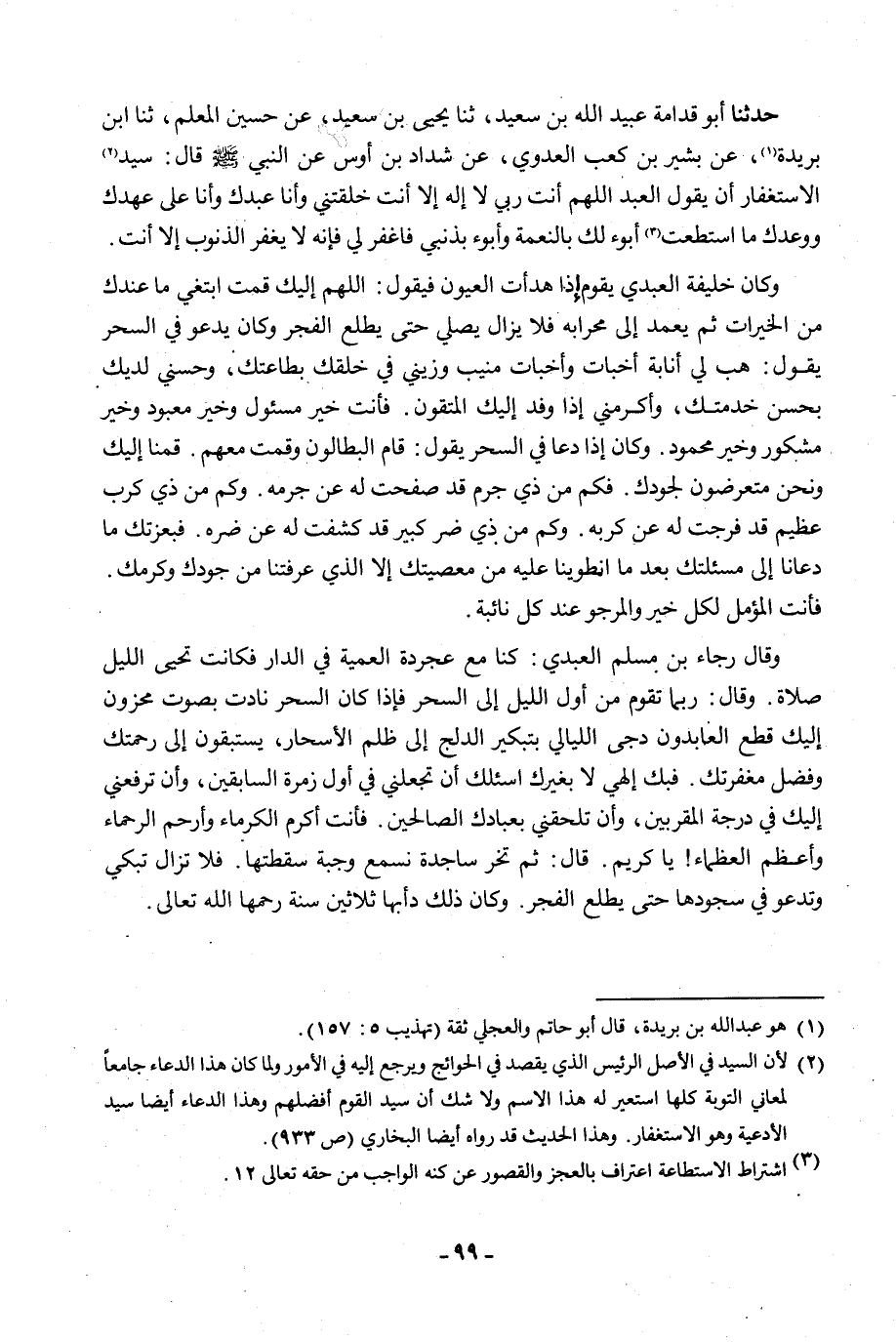 حَدَّثَنَا أَبُو قُدَامَةَ عُبَيْدُ اللَّهِ بْنُ سَعِيدٍ، ثنا يَحْيَى بْنُ سَعِيدٍ، عَنْ حُسَيْنٍ الْمُعَلِّمِ، ثنا ابْنُ بُرَيْدَةَ، عَنْ بُشَيْرِ بْنِ كَعْبٍ الْعَدَوِيِّ، عَنْ شَدَّادِ بْنِ أَوْسٍ، عَنِ النَّبِيِّ صَلَّى اللَّهُ عَلَيْهِ وَسَلَّمَ قَالَ: " §سَيِّدُ الِاسْتِغْفَارِ أَنْ يَقُولَ الْعَبْدُ: اللَّهُمَّ أَنْتَ رَبِّي لَا إِلَهَ إِلَّا أَنْتَ خَلَقْتَنِي وَأَنَا عَبْدُكَ، وَأَنَا عَلَى عَهْدِكَ وَوَعْدُكَ مَا اسْتَطَعْتُ، أَبُوءُ لَكَ بِالنِّعْمَةِ، وَأَبُوءُ بِذَنْبِي فَاغْفِرْ لِي فَإِنَّهُ لَا يَغْفِرُ الذُّنُوبَ إِلَّا أَنْتَ " وَكَانَ خَلِيفَةُ الْعَبْدِيُّ يَقُومُ إِذَا هَدَأَتِ الْعُيُونُ فَيَقُولُ: " اللَّهُمَّ إِلَيْكَ قُمْتُ أَبْتَغِي مَا عِنْدَكَ مِنَ الْخَيْرَاتِ، ثُمَّ يَعْمَدُ إِلَى مِحْرَابِهِ فَلَا يَزَالُ يُصَلِّي حَتَّى يَطْلُعَ الْفَجْرُ، وَكَانَ يَدْعُو فِي السَّحَرِ يَقُولُ: هَبْ لِي إِنَابَةَ إِخْبَاتٍ، وَإِخْبَاتَ مُنِيبٍ، وَزَيِّنِّي فِي خَلْقِكَ بِطَاعَتِكَ، وَحَسِّنِّي لَدَيْكَ بِحُسْنِ خِدْمَتِكَ، وَأَكْرِمْنِي إِذَا وَفَدَ إِلَيْكَ الْمُتَّقُونَ، فَأَنْتَ خَيْرُ مَسْئُولٍ، وَخَيْرُ معَبُّودٍ، وَخَيْرُ مَشْكُورٍ، وَخَيْرُ مَحْمُودٍ، وَكَانَ إِذَا دَعَا فِي السَّحَرِ يَقُولُ: قَامَ الْبَطَّالُونَ وَقُمْتُ مَعَهُمْ، قُمْنَا إِلَيْكَ وَنَحْنُ مُتَعَرِّضُونَ لِجُودِكَ، فَكَمْ مِنْ ذِي جُرْمٍ قَدْ صَفَحْتَ لَهُ عَنْ جُرْمِهِ، وَكَمْ مِنْ ذِي كَرِبٍ عَظِيمٍ قَدْ فَرَّجْتَ لَهُ عَنْ كَرَبِهِ، وَكَمْ مِنْ ذِي ضُرٍّ كَبِيرٍ قَدْ كَشَفْتَ لَهُ عَنْ ضُرِّهِ، فَبِعِزَّتِكَ مَا دَعَانَا إِلَى مَسْأَلَتِكَ بَعْدَ مَا انْطَوَيْنَا عَلَيْهِ مِنْ مَعْصِيَتِكَ إِلَّا الَّذِي عَرَّفْتَنَا مِنْ جُودِكَ وَكَرَمِكَ فَأَنْتَ الْمُؤَمَّلُ لِكُلِّ خَيْرٍ وَالْمَرْجُوُّ عِنْدَ كُلِّ نَائِبَةٍ " وَقَالَ رَجَاءُ بْنُ مُسْلِمٍ الْعَبْدِيُّ: كُنَّا مَعَ عَجْرَدَةَ الْعَمِيَّةَ فِي الدَّارِ فَكَانَتْ تُحْيِي اللَّيْلَ صَلَاةً، وَقَالَ: رُبَّمَا تَقُومُ مِنْ أَوَّلِ اللَّيْلِ إِلَى السَّحَرِ، فَإِذَا كَانَ السَّحَرُ نادَتْ بِصَوْتٍ مَحْزُونٍ: «إِلَيْكَ قَطَعَ الْعَابِدُونَ دُجَى اللَّيَالِي بِتَبْكِيرِ الدَّلَجِ إِلَى ظُلَمِ الْأَسْحَارِ، يَسْتَبِقُونَ إِلَى رَحْمَتِكَ وَفَضْلِ مَغْفِرَتِكَ، فَبِكَ إِلَهِيَ لَا بِغَيْرِكَ أَسْأَلُكَ أَنْ تَجْعَلَنِيَ فِي أَوَّلِ زُمْرَةِ السَّابِقِينَ، وَأَنْ تَرْفَعَنِي إِلَيْكَ فِي دَرَجَةِ الْمُقَرَّبِينَ، وَأَنْ تُلْحِقَنِي بِعِبَادِكَ الصَّالِحِينَ، فَأَنْتَ أَكْرَمُ الْكُرَمَاءِ، وَأَرْحَمُ الرُّحَمَاءِ، وَأَعْظَمُ الْعُظَمَاءِ، يَا كَرِيمُ» قَالَ: ثُمَّ تَخِرُّ سَاجِدَةً نَسْمَعُ وَجْبَةَ سَقْطَتِهَا، فَلَا تَزَالُ تَبْكِي وَتَدْعُو فِي سُجُودِهَا حَتَّى يَطْلُعَ الْفَجْرُ، وَكَانَ ذَلِكَ دَأْبُهَا ثَلَاثِينَ سَنَةً رَحِمَهَا اللَّهُ تَعَالَى