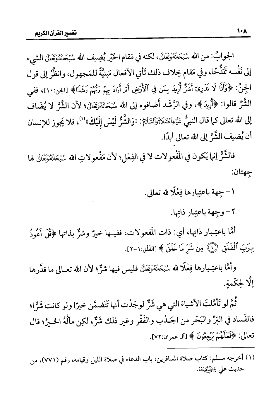فالشَّرُّ إنما يَكون في المَفْعولات لا في الفِعْل؛ لأن مَفْعولاتِ اللَّه سُبْحَانَهُ وَتَعَالَى لها جِهتان: