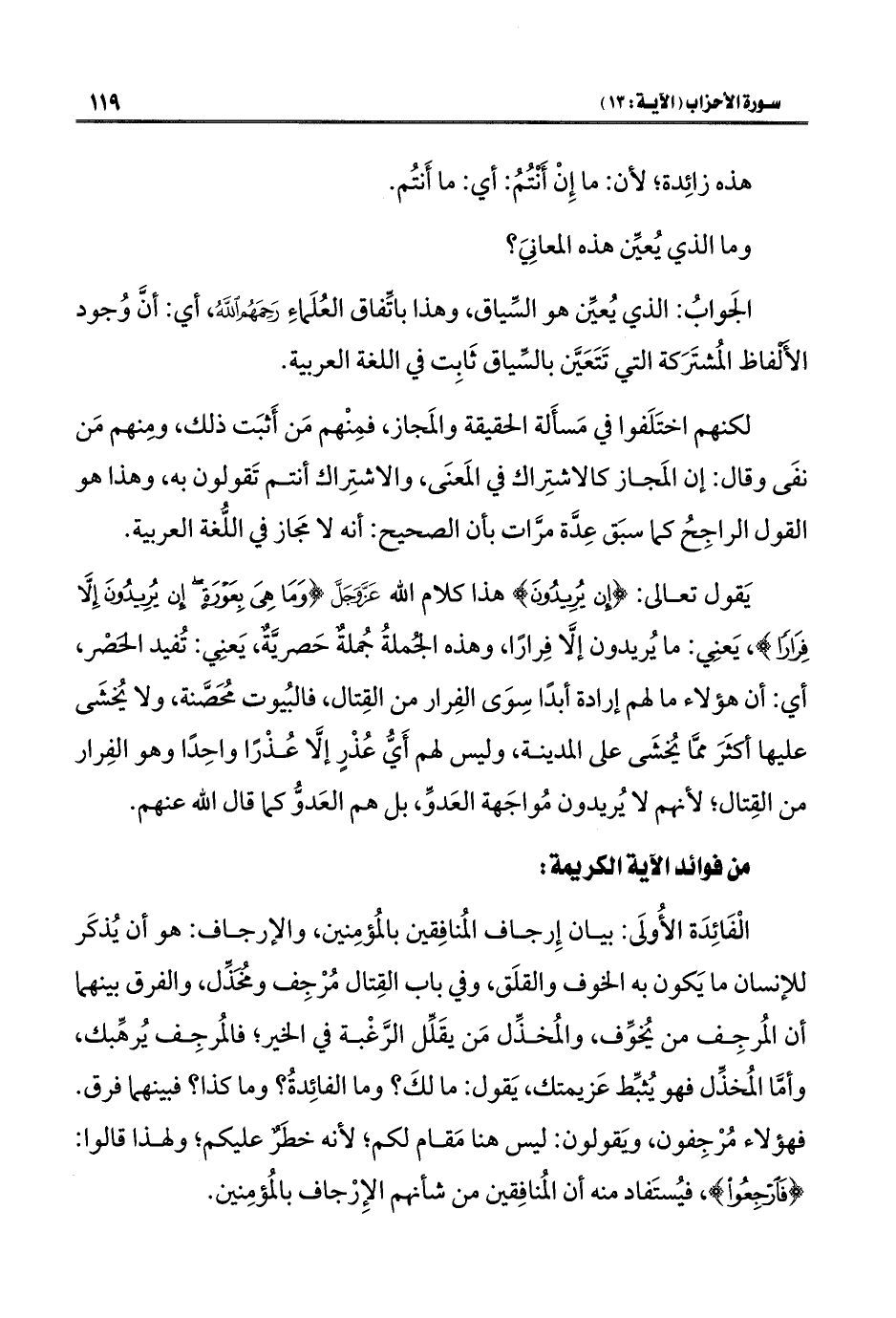 يَقول تعالى: {إِنْ يُرِيدُونَ} هذا كلام اللَّه عَزَّ وَجَلَّ {وَمَا هِيَ بِعَوْرَةٍ إِنْ يُرِيدُونَ إِلَّا فِرَارًا}، يَعنِي: ما يُريدون إلَّا فِرارًا، وهذه الجُملةُ جُملةٌ حَصريَّةٌ، يَعنِي: تُفيد الحَصْر، أي: أن هؤلاء ما لهم إرادة أبدًا سِوَى الفِرار من القِتال، فالبُيوت مُحَصَّنة، ولا يُخشَى عليها أكثَرَ ممَّا يُخشَى على المدينة، وليس لهم أَيُّ عُذْرٍ إلَّا عُذْرًا واحِدًا وهو الفِرار من القِتال؛ لأنهم لا يُريدون مُواجَهة العَدوِّ، بل هم العَدوُّ كما قال اللَّه عنهم.