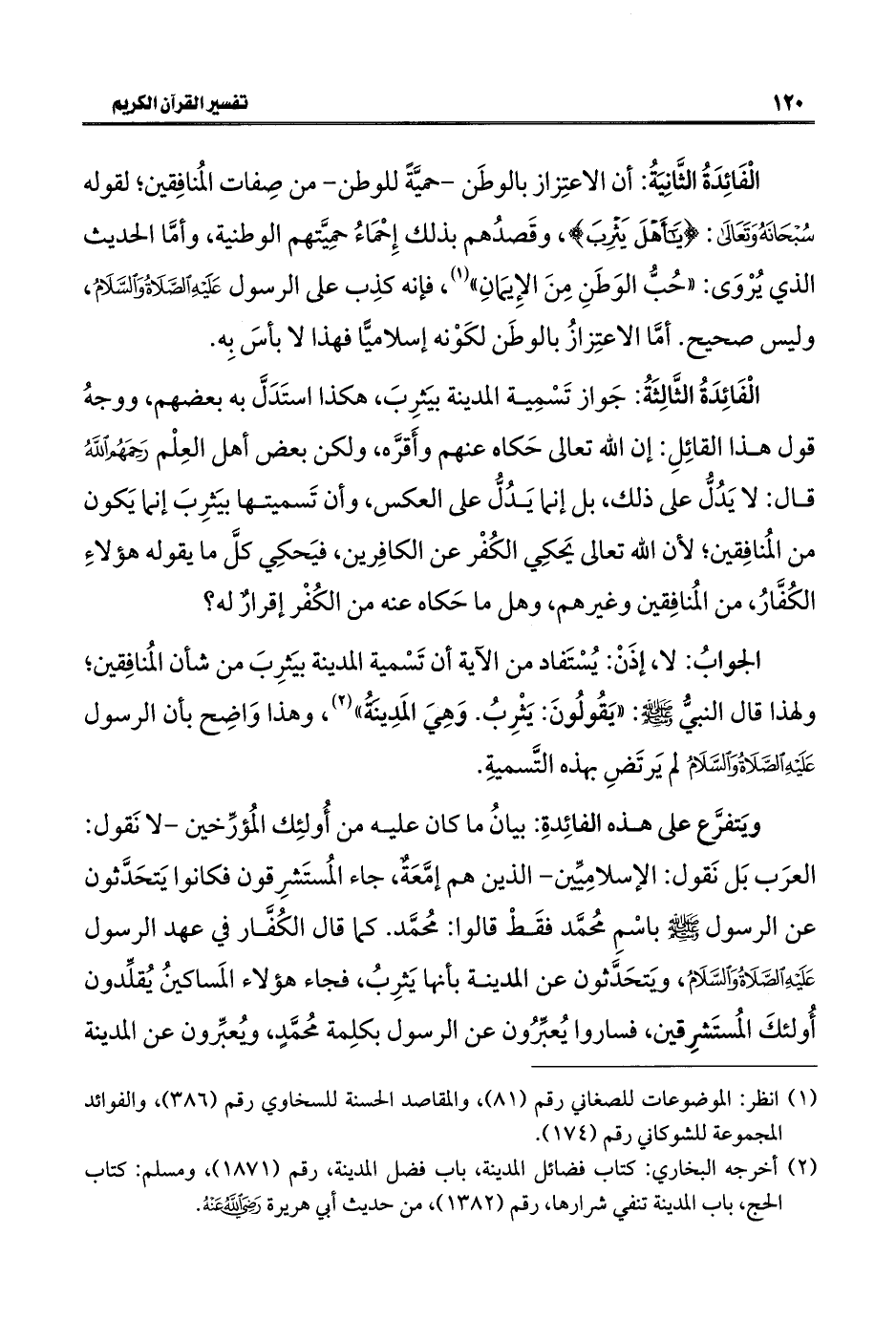 الْفَائِدَةُ الثَّانِيَةُ: أن الاعتِزاز بالوطَن -حميَّةً للوطن- من صِفات المُنافِقين؛ لقوله سُبْحَانَهُ وَتَعَالَى: {يَاأَهْلَ يَثْرِبَ}، وقَصدُهم بذلك إِحْمَاءُ حمِيَّتهم الوطنية، وأمَّا الحديث الذي يُرْوَى: "حُبُّ الوَطَنِ مِنَ الإِيمَانِ" (¬١)، فإنه كذِب على الرسول عَلَيْهِ الصَّلَاةُ وَالسَّلَامُ، وليس صحيح. أمَّا الاعتِزازُ بالوطَن لكَوْنه إسلاميًّا فهذا لا بأسَ بِه.