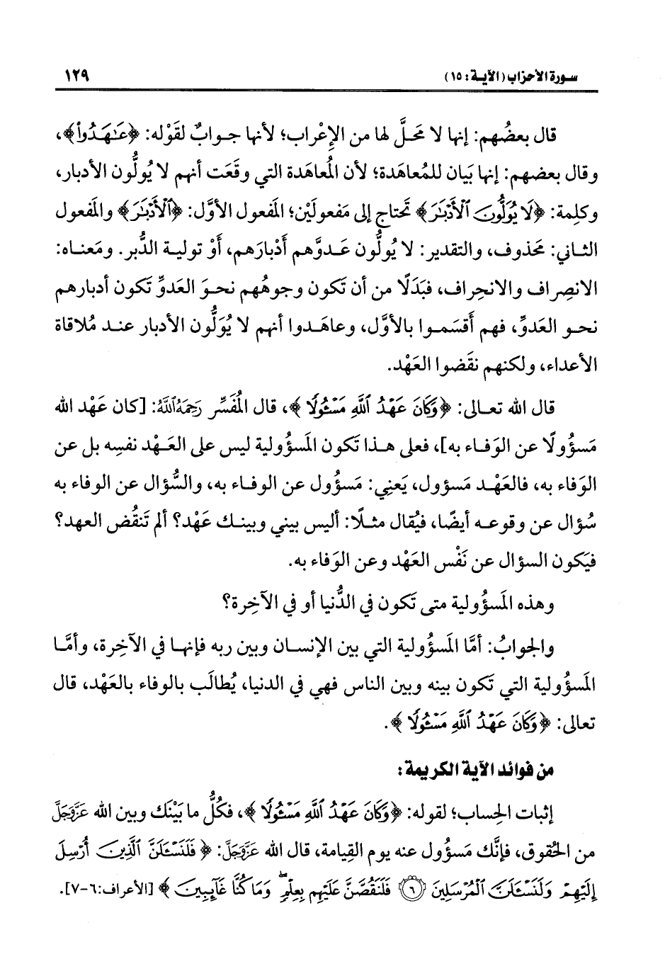 قال اللَّه تعالى: {وَكَانَ عَهْدُ اللَّهِ مَسْئُولًا}، قال المُفَسِّر رَحِمَهُ اللَّهُ: [كان عَهْد اللَّه مَسؤُولًا عن الوَفاء به]، فعلى هذا تَكون المَسؤُولية ليس على العَهْد نفسِه بل عن الوَفاء به، فالعَهْد مَسؤول، يَعنِي: مَسؤُول عن الوفاء به، والسُّؤال عن الوفاء به سُؤال عن وقوعه أيضًا، فيُقال مثلًا: أليس بيني وبينك عَهْد؟ ألم تَنقُض العهد؟ فيَكون السؤال عن نَفْس العَهْد وعن الوَفاء به.