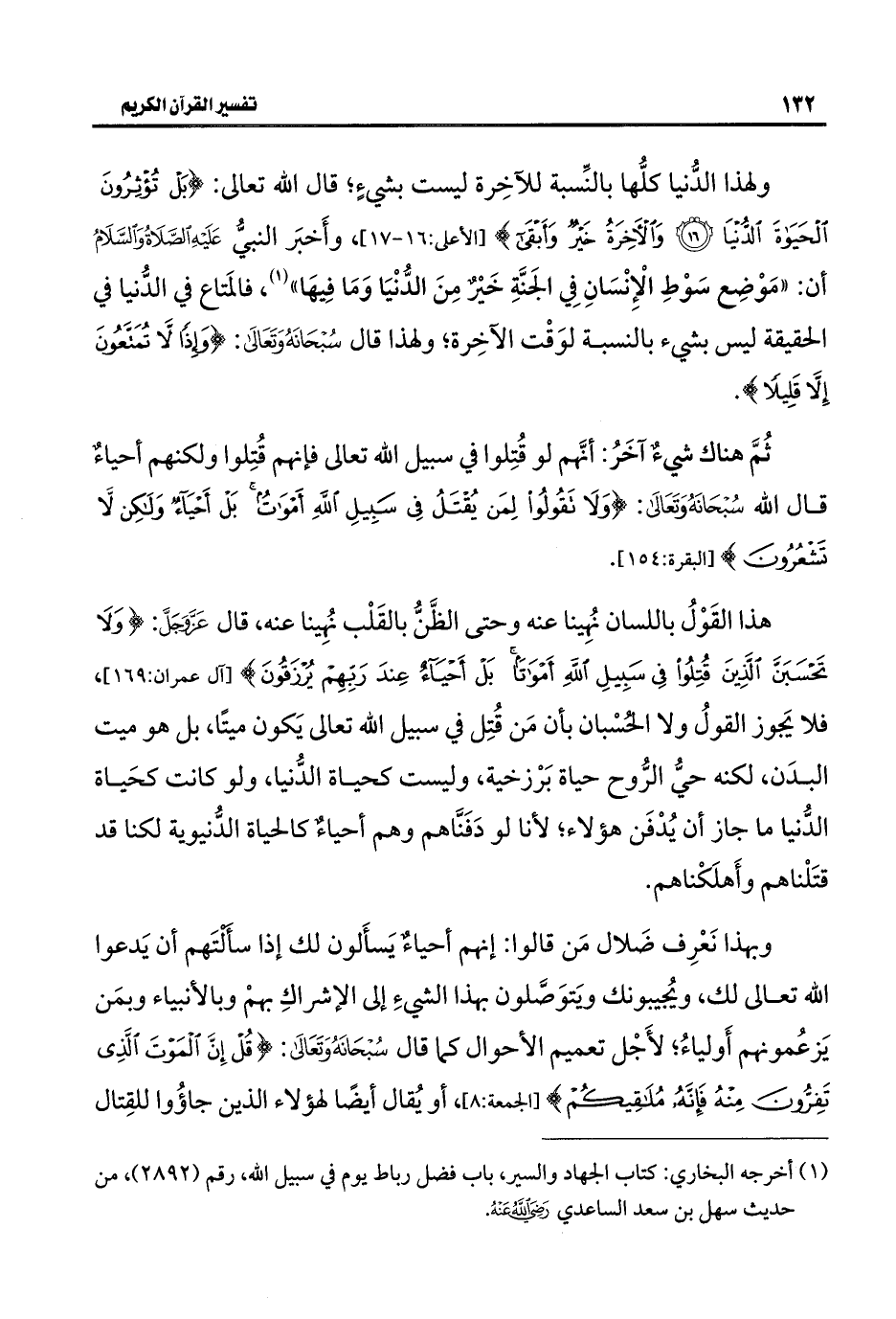 ثُمَّ هناك شيءٌ آخَرُ: أنَّهم لو قُتِلوا في سبيل اللَّه تعالى فإنهم قُتِلوا ولكنهم أحياءٌ قال اللَّه سُبْحَانَهُ وَتَعَالَى: {وَلَا تَقُولُوا لِمَنْ يُقْتَلُ فِي سَبِيلِ اللَّهِ أَمْوَاتٌ بَلْ أَحْيَاءٌ وَلَكِنْ لَا تَشْعُرُونَ} [البقرة: ١٥٤].