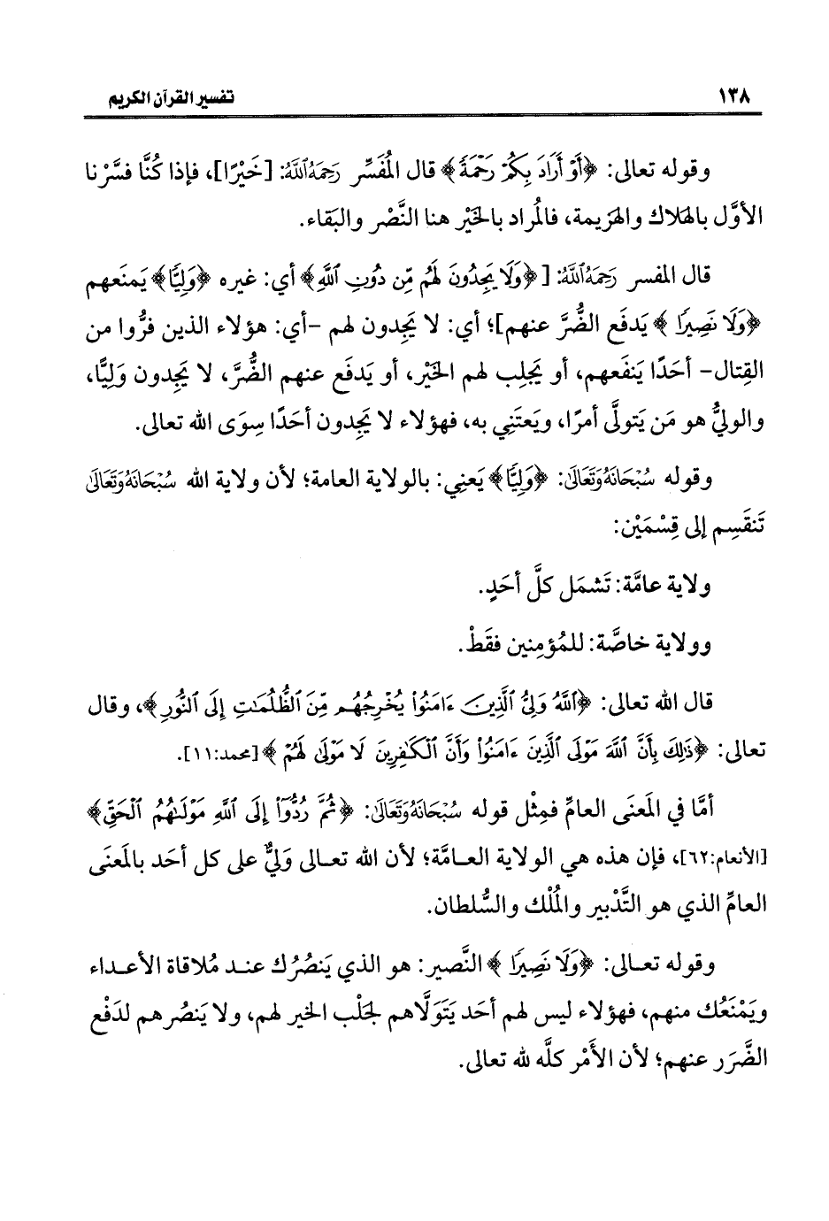 أمَّا في المَعنَى العامّ فمِثْل قوله سُبْحَانَهُ وَتَعَالَى: {ثُمَّ رُدُّوا إِلَى اللَّهِ مَوْلَاهُمُ الْحَقِّ} [الأنعام: ٦٢]، فإن هذه هي الولاية العامَّة؛ لأن اللَّه تعالى وَليٌّ على كل أحَد بالمَعنَى العامِّ الذي هو التَّدْبير والمُلْك والسُّلطان.