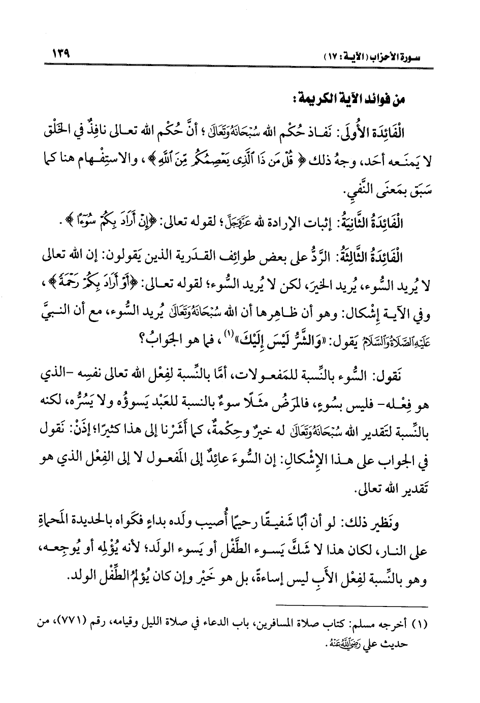 الْفَائِدَةُ الثَّالِثَةُ: الرَّدُّ على بعض طوائِف القدَرية الذين يَقولون: إن اللَّه تعالى لا يُريد السُّوء، يُريد الخيرَ، لكن لا يُريد السُّوء؛ لقوله تعالى: {أَوْ أَرَادَ بِكُمْ رَحْمَةً}، وفي الآية إِشْكال: وهو أن ظاهِرها أن اللَّه سُبْحَانَهُ وَتَعَالَى يُريد السُّوء، مع أن النبيَّ عَلَيْهِ الصَّلَاةُ وَالسَّلَامُ يَقول: "وَالشَّرُّ لَيْسَ إِلَيْكَ" (¬١)، فما هو الجوابُ؟