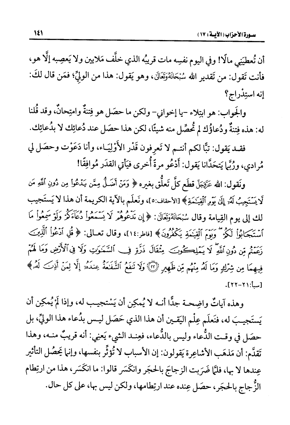 وهذه آياتٌ واضِحة جدًّا أنه لا يُمكِن أن يَسْتجيب له، وإذا لَمْ يُمكِن أن يَستَجيبَ له، فنَعلَم عِلْم اليَقين أن هذا الذي حَصَل ليس بدُعاء هذا الوليِّ، بل حصَل في وقت الدُّعاء وليس بالدُّعاء، فعِند الشيء يَعنِي: أنه قريبٌ منه، وهذا تَقدَّم: أن مَذهَب الأشاعِرة يَقولون: إن الأسباب لا تُؤثِّر بنفسها، وإنما يَحصُل التأثير عِندها لا بها، فلمَّا ضَرَبت الزجاجَ بالحجَر وانكَسَر قالوا: ما انكَسَر، هذا من ارتطام الزُّجاج بالحجَر، حصَل عِنده عند ارتِطامها، ولكن ليس بها، على كل حال.