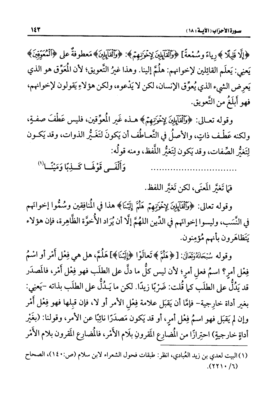 وقوله تعالى: {وَالْقَائِلِينَ لِإِخْوَانِهِمْ} هذه غَير المُعوِّقين، فليس عَطْفَ صفةٍ، ولكنه عَطْف ذاتٍ، والأصلُ في التَّعاطُف أن يَكونَ لتَغَيُّر الذوات، وقد يَكون لِتَغيُّر الصِّفات، وقد يَكون لِتَغيُّر اللَّفظ، ومنه قولُه: