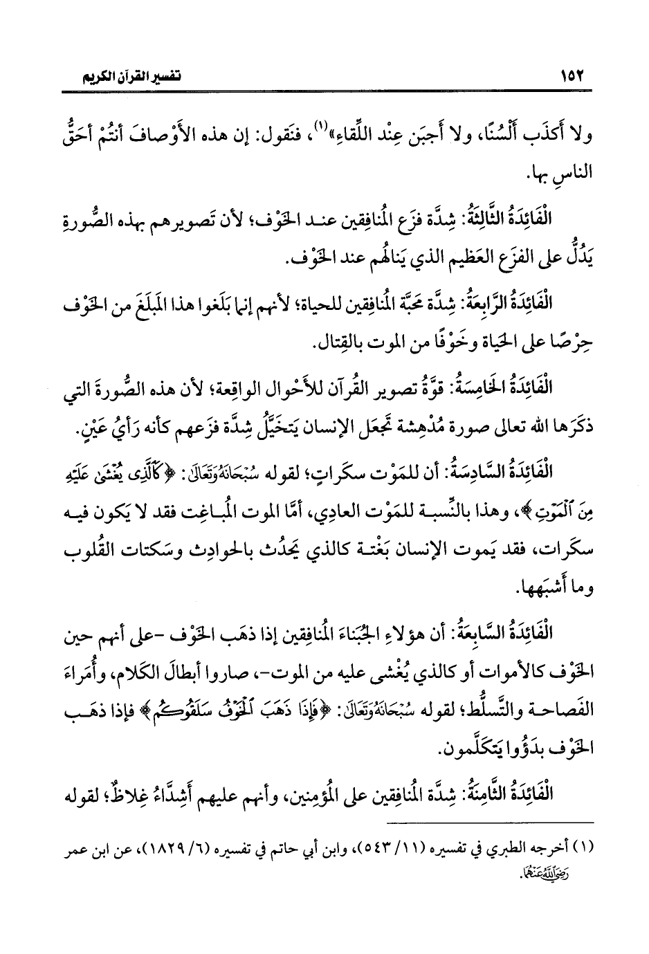 الْفَائِدَةُ الرَّابِعَةُ: شِدَّة مَحبَّة المُنافِقين للحياة؛ لأنهم إنما بَلَغوا هذا المَبلَغَ من الخَوْف حِرْصًا على الحَياة وخَوْفًا من الموت بالقِتال.