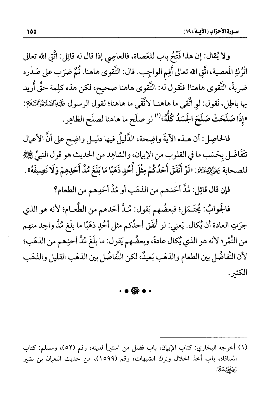 فالحاصِل: أن هذه الآيةَ واضِحة، الدَّليلُ فيها دليل واضِح على أنَّ الأعمال تتَفَاضَل بِحَسَب ما في القلوب من الإيمان, والشاهِد من الحديث هو قول النبيِّ -صلى اللَّه عليه وسلم- للصحابة -رضي اللَّه عنهم -: "لَوْ أَنْفَقَ أَحَدُكُمْ مِثْلَ أُحُدٍ ذَهَبًا مَا بَلَغَ مُدَّ أَحَدِهِمْ وَلَا نَصِيفَهُ".