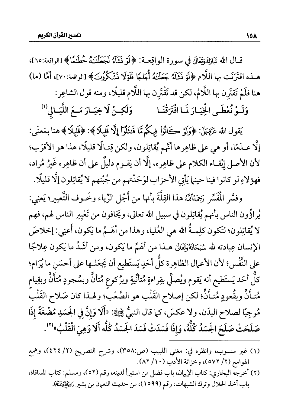 وفسَّر المُفَسِّر رَحِمَهُ اللَّهُ هذا القِلَّةَ بأنها من أَجْل الرِّياء وخَوف التَّعيير؛ يَعنِي: يُراؤُون الناس بأنهم يُقاتِلون في سبيل اللَّه تعالى، ويَخافون من تَعْيِير الناس لهم، فهم لا يُقاتِلون؛ لتكون كلِمةُ اللَّه هي العُليا، وهذا من أهَمِّ ما يَكون، أَعنِي: إخلاصَ الإنسان عِبادته للَّه سُبْحَانَهُ وَتَعَالَى هذا من أهَمِّ ما يَكون، ومن أشَدِّ ما يَكون عِلاجًا على النَّفْس؛ لأن الأعمال الظاهِرة كلُّ أحَدٍ يَستَطيع أن يَجعَلها على أحسَنِ ما يُرَام؛ كلُّ أحَد يَستَطيع أنه يَقوم ويُصلِّي بقِراءةٍ مُتأنِّيةٍ وبرُكوعٍ مُتأنٍّ وبسُجودٍ مُتأَنٍّ وبقِيامٍ مُتأَنٍّ وبقُعودٍ مُتأَنٍّ؛ لكن إصلاح القَلْب هو الصَّعْب؛ ولهذا كان صَلاح القَلْب مُوجِبًا لصلاح البدَن، ولا عكسَ، كما قال النبيُّ -صلى اللَّه عليه وسلم-: "أَلَا وَإِنَّ في الجَسَدِ مُضْغَةً إِذَا صَلَحَتْ صَلَحَ الجَسَدُ كُلُّهُ، وَإِذَا فَسَدَتْ فَسَدَ الجَسَدُ كُلُّه أَلَا وَهِيَ الْقَلْبُ" (¬٢).
