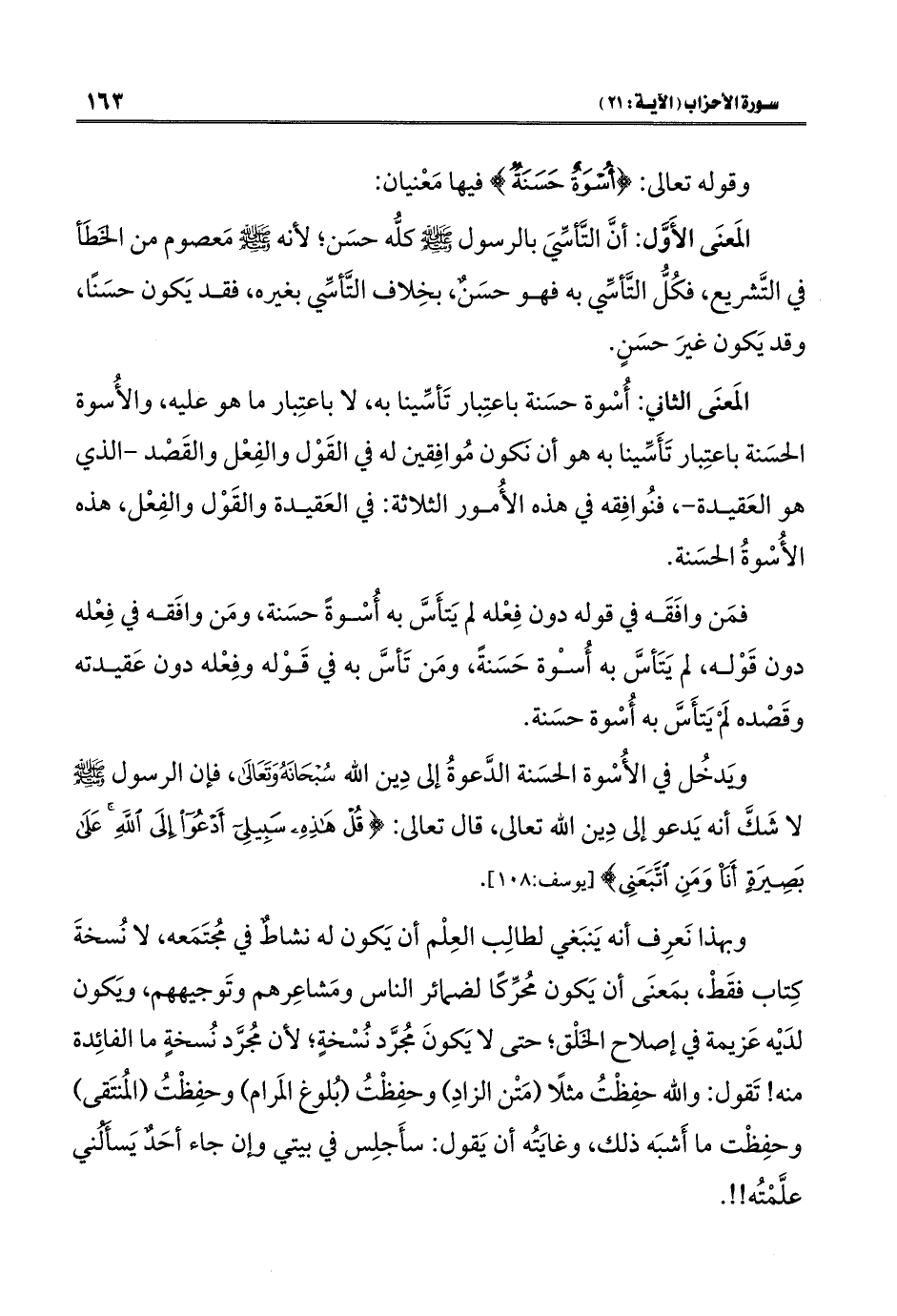 المَعنَى الثاني: أُسْوة حسَنة باعتِبار تَأسِّينا به، لا باعتِبار ما هو عليه، والأُسوة الحسَنة باعتِبار تَأَسِّينا به هو أن نَكون مُوافِقين له في القَوْل والفِعْل والقَصْد -الذي هو العَقيدة-، فنُوافِقه في هذه الأُمور الثلاثة: في العَقيدة والقَوْل والفِعْل، هذه الأُسْوةُ الحسَنة.