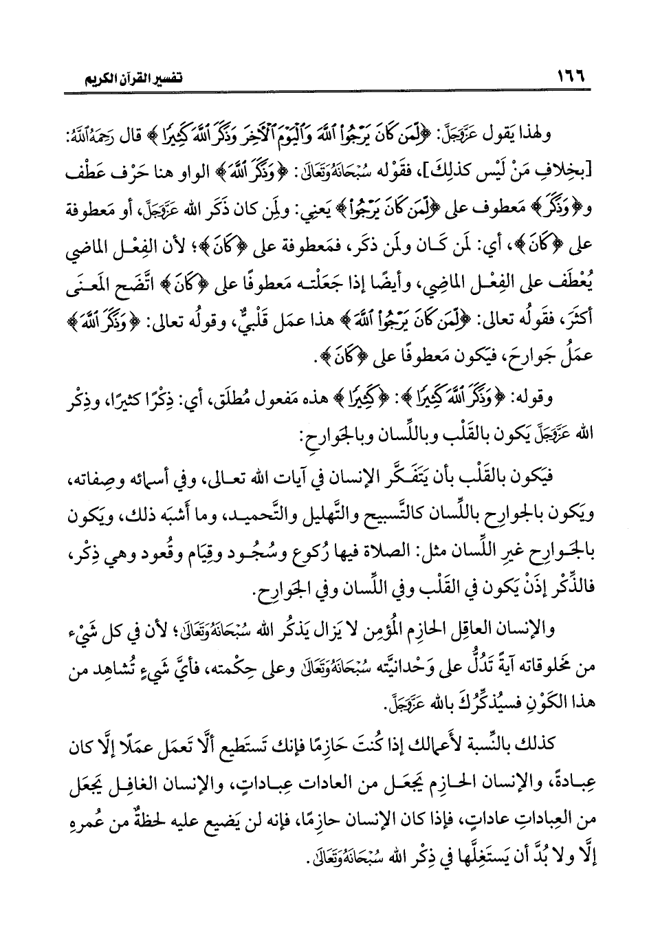 ولهذا يَقول عَزَّ وَجَلَّ: {لِمَنْ كَانَ يَرْجُو اللَّهَ وَالْيَوْمَ الْآخِرَ وَذَكَرَ اللَّهَ كَثِيرًا} قال رَحِمَهُ اللَّهُ: [بخِلافِ مَنْ لَيْس كذلِكَ]، فقَوْله سُبْحَانَهُ وَتَعَالَى: {وَذَكَرَ اللَّهَ} الواو هنا حَرْف عَطْف و {وَذَكَرَ} مَعطوف على {لِمَنْ كَانَ يَرْجُو} يَعنِي: ولمِن كان ذَكَر اللَّه عَزَّ وَجَلَّ، أو مَعطوفة على {كَانَ}، أي: لمَن كَان ولمَن ذكَر، فمَعطوفة على {كَانَ}؛ لأن الفِعْل الماضي يُعْطَف على الفِعْل الماضِي، وأيضًا إذا جَعَلْته مَعطوفًا على {كَانَ} اتَّضَح المَعنَى أكثَرَ، فقَولُه تعالى: {لِمَنْ كَانَ يَرْجُوا اللَّهَ} هذا عمَل قَلْبيٌّ، وقولُه تعالى: {وَذَكَرَ اللَّهَ} عمَلُ جَوارحَ، فيَكون مَعطوفًا على {كَانَ}.
