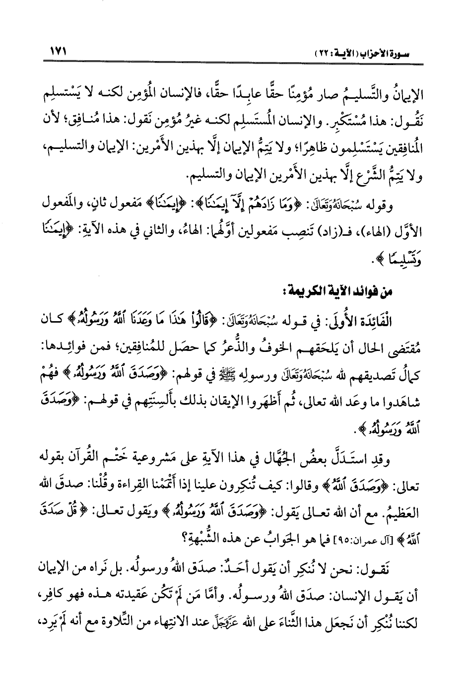 الْفَائِدَة الأُولَى: في قوله سُبْحَانَهُ وَتَعَالَى: {قَالُوا هَذَا مَا وَعَدَنَا اللَّهُ وَرَسُولُهُ} كان مُقتَضى الحال أن يَلحَقهم الخوفُ والذُّعرُ كما حصَل للمُنافِقين؛ فمن فوائِدها: كمالُ تَصديقهم للَّه سُبْحَانَهُ وَتَعَالَى ورسولِه -صلى اللَّه عليه وسلم- في قولهم: {وَصَدَقَ اللَّهُ وَرَسُولُهُ} فهُمْ شاهَدوا ما وعَد اللَّه تعالى، ثُم أَظهَروا الإيقان بذلك بأَلسِنَتِهم في قولهم: {وَصَدَقَ اللَّهُ وَرَسُولُهُ}.
