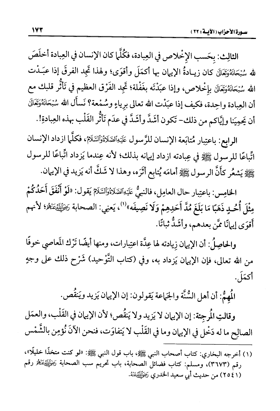 والحاصِلُ: أن الإيمان زِيادته لها عِدَّة اعتِبارات، ومنها أيضًا تَرْك المَعاصي خوفًا من اللَّه تعالى، فإن الإيمان يَزداد به، وفي (كتاب التَّوْحيد) شَرْح ذلك على وجهٍ أكمَلَ.