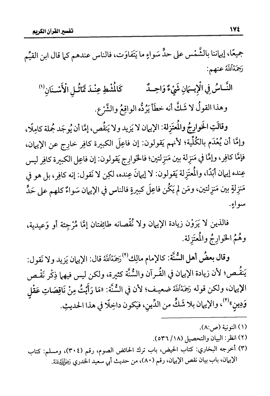 وقال بعضُ أهل السُّنَّة: كالإمام مالِك (¬٢) رَحِمَهُ اللَّهُ قال: الإيمان يَزيد ولا نَقول: يَنقُص؛ لأن زيادة الإيمان في القُرآن والسُّنَّة كثيرة، ولكن ليس فيهما ذِكْر نَقْص الإيمان، ولكن قوله رَحِمَهُ اللَّهُ ضعيف؛ لأن في السُّنَّة: "مَا رَأَيْتُ مِنْ نَاقِصَاتِ عَقْلٍ وَدِينٍ" (¬٣)، والإيمان بلا شَكٍّ من الدِّينِ، فيَكون داخِلًا في هذا الحديثِ.