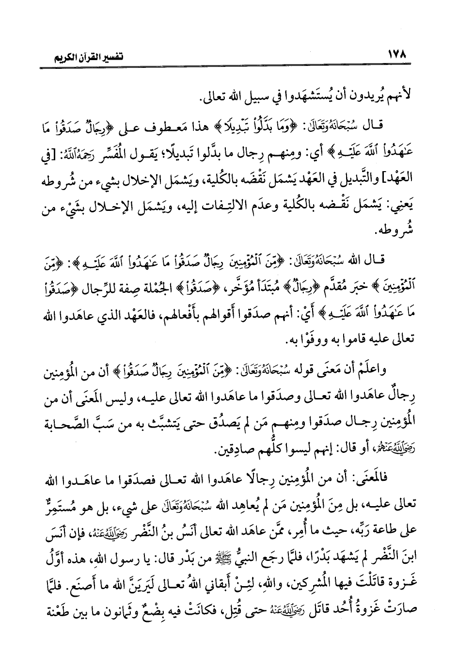 قال اللَّه سُبْحَانَهُ وَتَعَالَى: {مِنَ الْمُؤْمِنِينَ رِجَالٌ صَدَقُوا مَا عَاهَدُوا اللَّهَ عَلَيْهِ}: {مِنَ الْمُؤْمِنِينَ} خبَر مُقدَّم {رِجَالٌ} مُبتَدَأ مُؤَخَّر، {صَدَقُوا} الجُمْلة صِفة للرِّجال {صَدَقُوا مَا عَاهَدُوا اللَّهَ عَلَيْهِ} أَيْ: أنهم صدَقوا أَقوالهم بأَفْعالهم، فالعَهْد الذي عاهَدوا اللَّه تعالى عليه قاموا به ووفَوْا به.