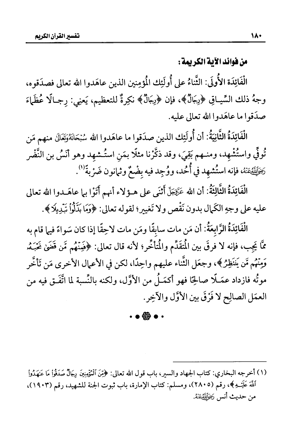 الْفَائِدَةُ الرَّابِعَةُ: أن مَن مات سابِقًا ومَن مات لاحِقًا إذا كان سَواءً فيما قام به ممَّا يَجِب، فإنه لا فرقَ بين المُتقَدِّم والمُتأخِّر؛ لأنه قال تعالى: {فَمِنْهُمْ مَنْ قَضَى نَحْبَهُ وَمِنْهُمْ مَنْ يَنْتَظِرُ}، وجعَل الثَّناء عليهم واحِدًا، لكن في الأعمال الأخرى مَن تَأخَّر موتُه فازداد عمَلًا صالِحًا فهو أكمَلُ من الأوَّل، ولكنه بالنِّسبة لما اتَّفَق فيه من العمَل الصالِح لا فَرْقَ بين الأوَّل والآخِر.