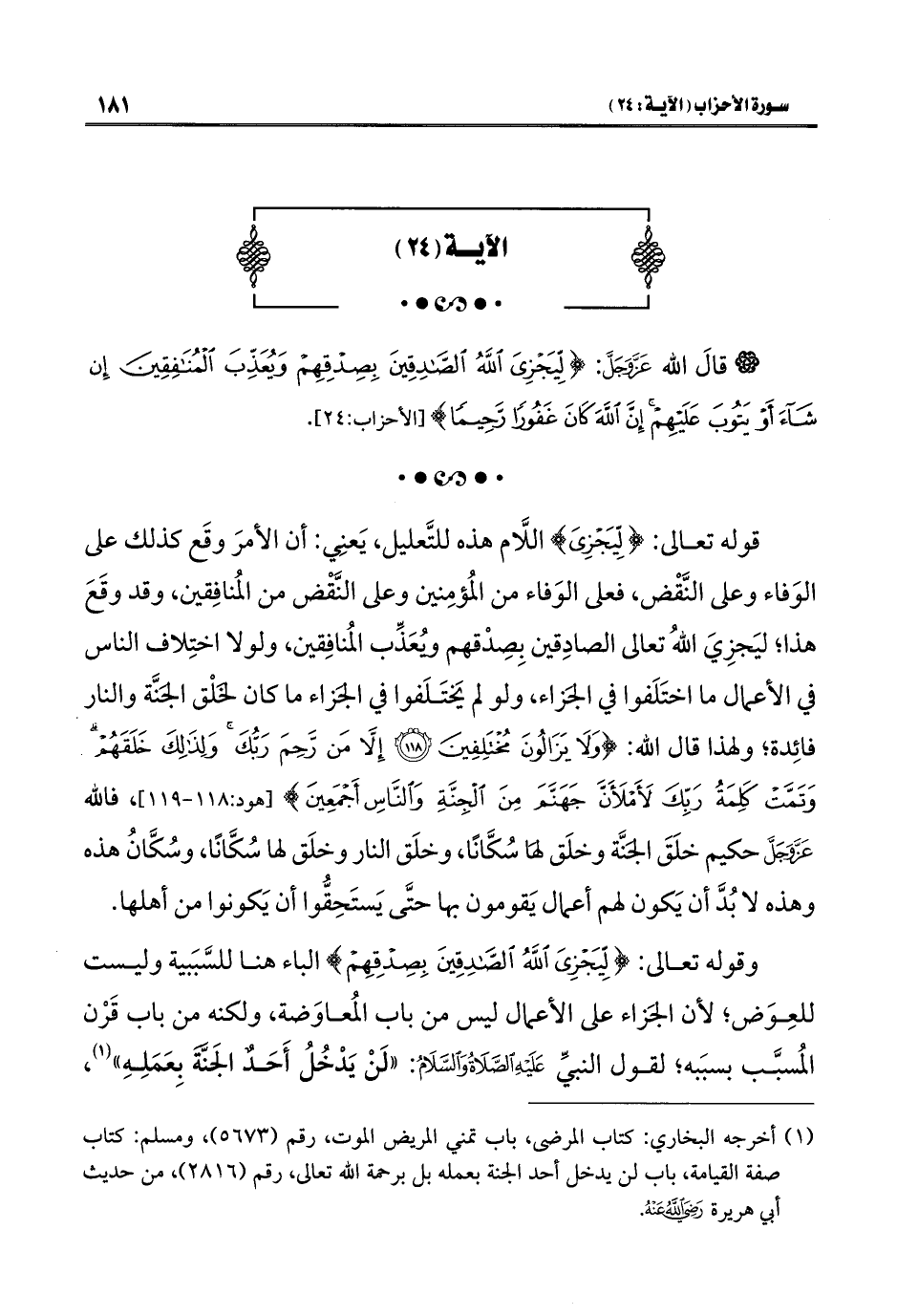 قوله تعالى: {لِيَجْزِيَ} اللَّه هذه للتَّعليل، يَعنِي: أن الأمرَ وقَع كذلك على الوَفاء وعلى النَّقْض، فعلى الوَفاء من المُؤمِنين وعلى النَّقْض من المُنافِقين، وقد وقَعَ هذا؛ ليَجزِيَ اللَّهُ تعالى الصادِقين بِصِدْقهم ويُعَذِّب المُنافِقين، ولولا اختِلاف الناس في الأعمال ما اختَلَفوا في الجَزاء، ولو لم يَختَلَفوا في الجزاء ما كان لخَلْق الجنَّة والنار فائِدة؛ ولهذا قال اللَّه: {وَلَا يَزَالُونَ مُخْتَلِفِينَ (١١٨) إِلَّا مَنْ رَحِمَ رَبُّكَ وَلِذَلِكَ خَلَقَهُمْ وَتَمَّتْ كَلِمَةُ رَبِّكَ لَأَمْلَأَنَّ جَهَنَّمَ مِنَ الْجِنَّةِ وَالنَّاسِ أَجْمَعِينَ (١١٩)} [هود: ١١٨ - ١١٩] فاللَّه عَزَّ وَجَلَّ حكيم خلَقَ الجنَّة وخلَق بها سُكَّانًا، وخلَق النار وخلَق لها سُكَّانًا، وسُكَّانُ هذه وهذه لا بُدَّ أن يَكون لهم أعمال يَقومون بها حتَّى يَستَحِقُّوا أن يَكونوا من أهلها.
