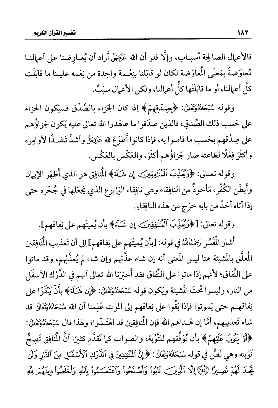 وقوله تعالى: {وَيُعَذِّبَ الْمُنَافِقِينَ إِنْ شَاءَ} المُنافِق هو الذي أَظهَر الإيمان وأَبطَن الكُفْر، مَأخوذ من النافِقاء وهي نافِقاء اليَرْبوع الذي يَجعَلها في جُحْره حتى إذا أتاه أحَدٌ من بابه خرَج من هذه النافِقاءِ.