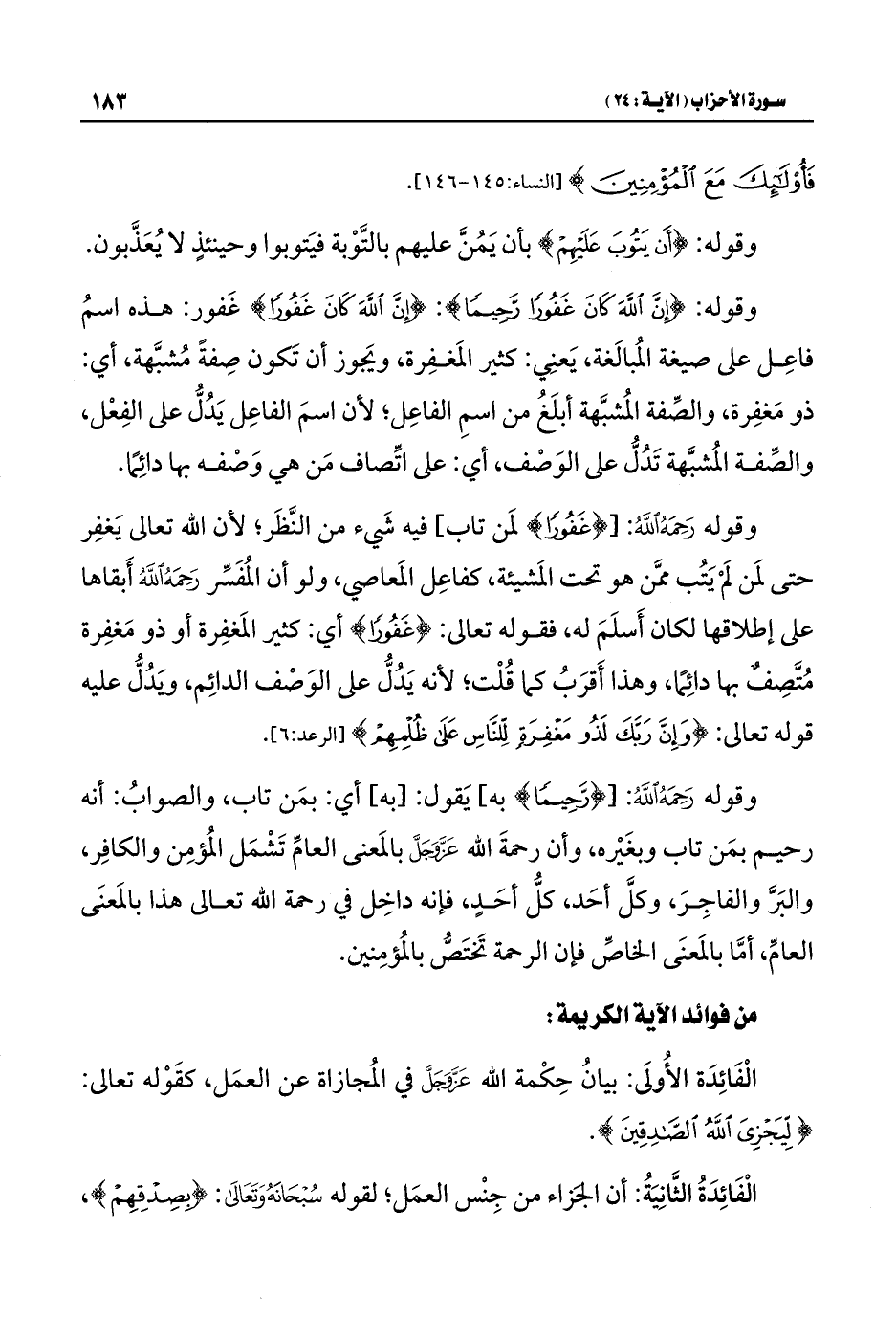 وقوله رَحِمَهُ اللَّهُ: [{غَفُورًا} لمَن تاب] فيه شَيء من النَّظَر؛ لأن اللَّه تعالى يَغفِر حتى لمَن لَمْ يَتُب ممَّن هو تحت المَشيئة، كفاعِل المَعاصي، ولو أن المُفَسِّر رَحِمَهُ اللَّهُ أَبقاها على إطلاقها لكان أَسلَمَ له، فقوله تعالى: {غَفُورًا} أي: كثير المَغفِرة أو ذو مَغفِرة مُتَّصِفٌ بها دائِما، وهذا أَقرَبُ كما قُلْت؛ لأنه يَدُلُّ على الوَصْف الدائِم، ويَدُلُّ عليه قوله تعالى: {وَإِنَّ رَبَّكَ لَذُو مَغْفِرَةٍ لِلنَّاسِ عَلَى ظُلْمِهِمْ} [الرعد: ٦].
