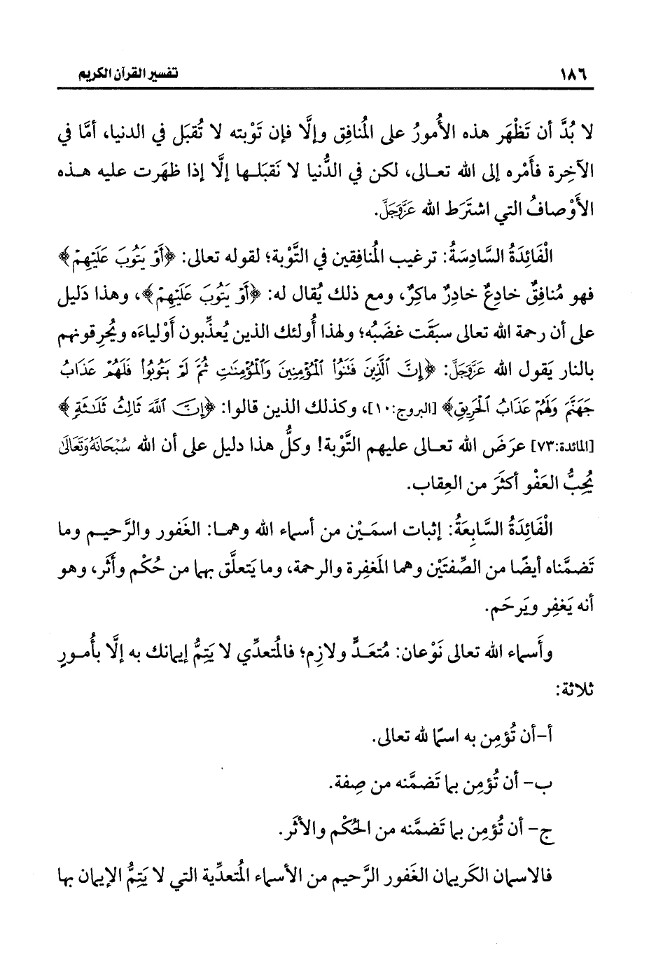وأَسماء اللَّه تعالى نَوْعان: مُتعَدٍّ ولازِم؛ فالمُتعدِّي لا يَتِمُّ إيمانك به إلَّا بأُمورٍ ثلاثة: