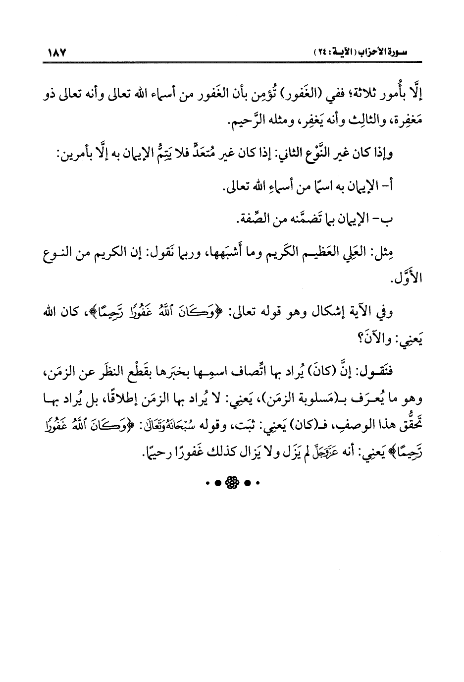 إلَّا بأُمور ثلاثة؛ ففي (الغَفور) تُؤمِن بأن الغَفور من أسماء اللَّه تعالى وأنه تعالى ذو مَغفِرة، والثالِث وأنه يَغفِر، ومثله الرَّحيم.