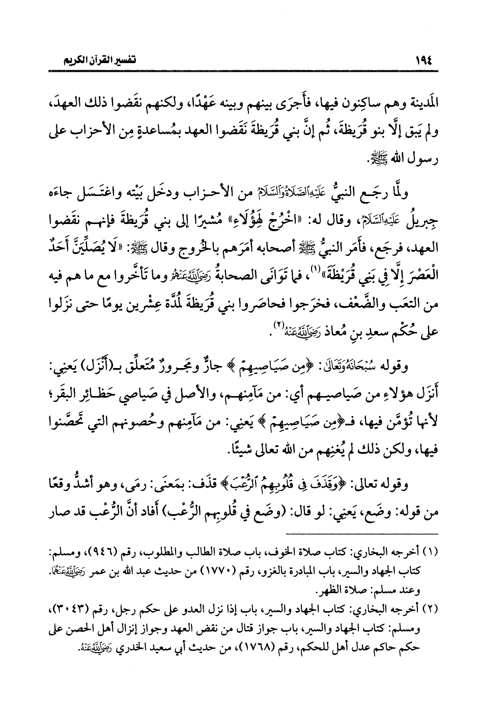ولمَّا رجَع النبيّ عَلَيْهِ الصَّلَاةُ وَالسَّلَامُ من الأحزاب ودخَل بَيْته واغتَسَل جاءَه جِبريلُ عَلَيْهِ السَّلَامُ، وقال له: "اخْرُجْ لهِؤُلَاءِ" مُشيرَا إلى بني قُرَيظةَ فإنهم نقَضوا العهد، فرجَع، فأَمَر النبيُّ -صلى اللَّه عليه وسلم- أصحابه أمَرَهم بالخُروج وقال -صلى اللَّه عليه وسلم-: "لَا يُصَلِّيَنَّ أَحَدٌ الْعَصْرَ إِلَّا في بَنِي قُرَيْظَةَ" (¬١)، فما تَوَانَى الصحابةُ -رضي اللَّه عنهم- وما تَأخَّروا مع ما هم فيه من التعَب والضَّعْف، فخرَجوا فحاصَروا بني قُرَيظةَ لمُدَّة عِشْرين يومًا حتى نزَلوا على حُكْم سعدِ بنِ مُعاذ -رضي اللَّه عنه- (¬٢).