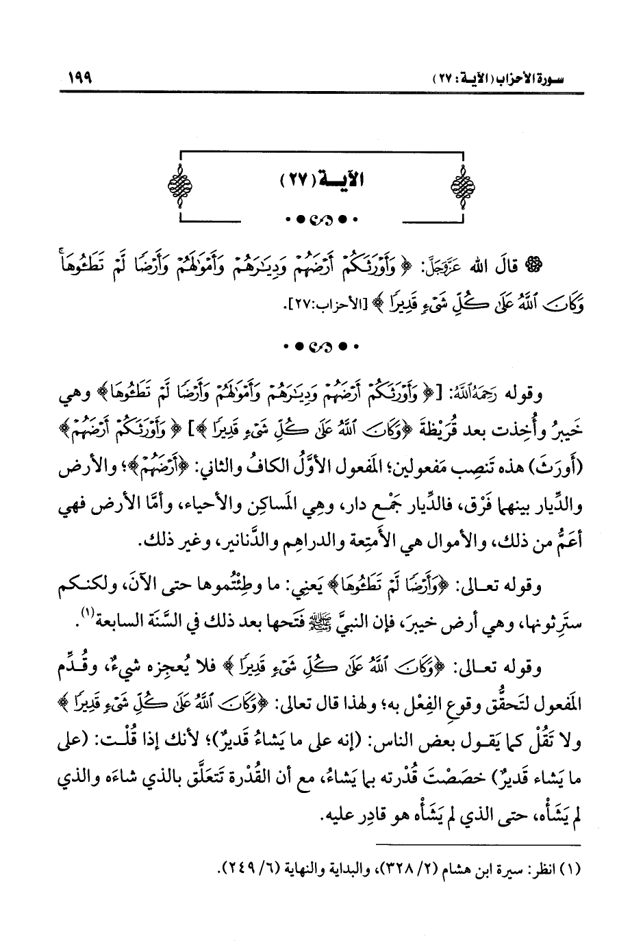 وقوله رَحِمَهُ اللَّهُ: [{وَأَوْرَثَكُمْ أَرْضَهُمْ وَدِيَارَهُمْ وَأَمْوَالَهُمْ وَأَرْضًا لَمْ تَطَئُوهَا} وهي خَيبرُ وأُخِذت بعد قُرَيْظةَ {وَكَانَ اللَّهُ عَلَى كُلِّ شَيْءٍ قَدِيرًا}]، {وَأَوْرَثَكُمْ أَرْضَهُمْ} (أَورَثَ) هذه تَنصِب مَفعولين؛ المَفعول الأوَّلُ الكافُ والثاني: {أَرْضَهُمْ}؛ والأرض والدِّيار بينهما فَرْق، فالدِّيار جَمْع دار، وهِي المَساكِن والأحياء، وأمَّا الأرض فهي أعَمُّ من ذلك، والأموال هي الأَمتِعة والدراهِم والدَّنانير، وغير ذلك.