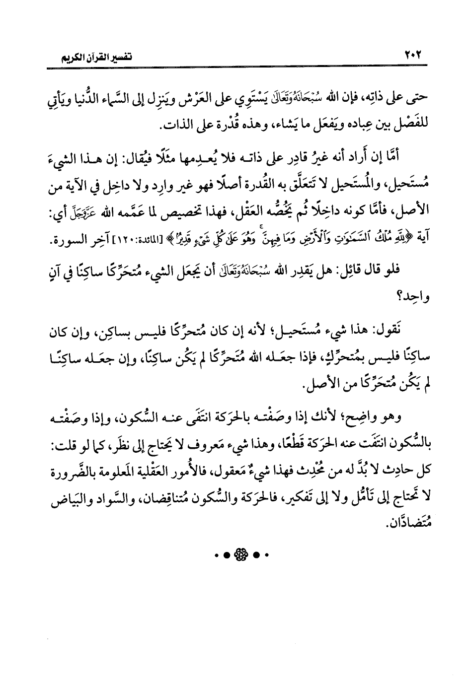 أمَّا إن أَراد أنه غيرُ قادِر على ذاته فلا يُعدِمها مثَلًا فيُقال: إن هذا الشيءَ مُستَحيل، والمُستَحيل لا تَتعَلَّق به القُدرة أصلًا فهو غير وارِد ولا داخِل في الآية من الأصل، فأمَّا كونه داخِلًا ثُم يَخُصُّه العَقْل، فهذا تخصيص لما عَمَّمه اللَّه عَزَّ وَجَلَّ أي: آية {لِلَّهِ مُلْكُ السَّمَاوَاتِ وَالْأَرْضِ وَمَا فِيهِنَّ وَهُوَ عَلَى كُلِّ شَيْءٍ قَدِيرٌ} [المائدة: ١٢٠] آخِر السورة.