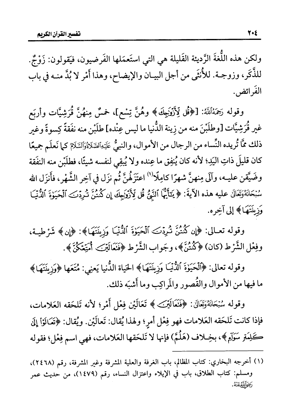 وقوله رَحِمَهُ اللَّهُ: [{قُلْ لِأَزْوَاجِكَ} وهُنَّ تِسْع]، خمسٌ مِنهُنَّ قُرَشِيَّات وأربَع غير قُرَشِيَّات [وطلَبْنَ منه من زِينة الدُّنيا ما ليس عِنْده، طلَبْن منه نفَقة كِسوةً وغير ذلك ممَّا تُريده النِّساء من الرجال من الأموال، والنبيُّ عَلَيْهِ الصَّلَاةُ وَالسَّلَامُ كما نَعلَم جميعًا كان قليلَ ذاتِ اليَدِ؛ لأنه كان يُنفِق ما عِنده ولا يُبقِي لنفسه شيئًا، فطلَبْن منه النفَقة وضَيَّقن عليه، وآلَى مِنهنَّ شهرًا كامِلًا (¬١) اعتَزَلهُنَّ ثُم نزَل في آخِر الشَّهْر، فأَنزَل اللَّه سُبْحَانَهُ وَتَعَالَى عليه هذه الآيةَ: {يَاأَيُّهَا النَّبِيُّ قُلْ لِأَزْوَاجِكَ إِنْ كُنْتُنَّ تُرِدْنَ الْحَيَاةَ الدُّنْيَا وَزِينَتَهَا} إلى آخِره.