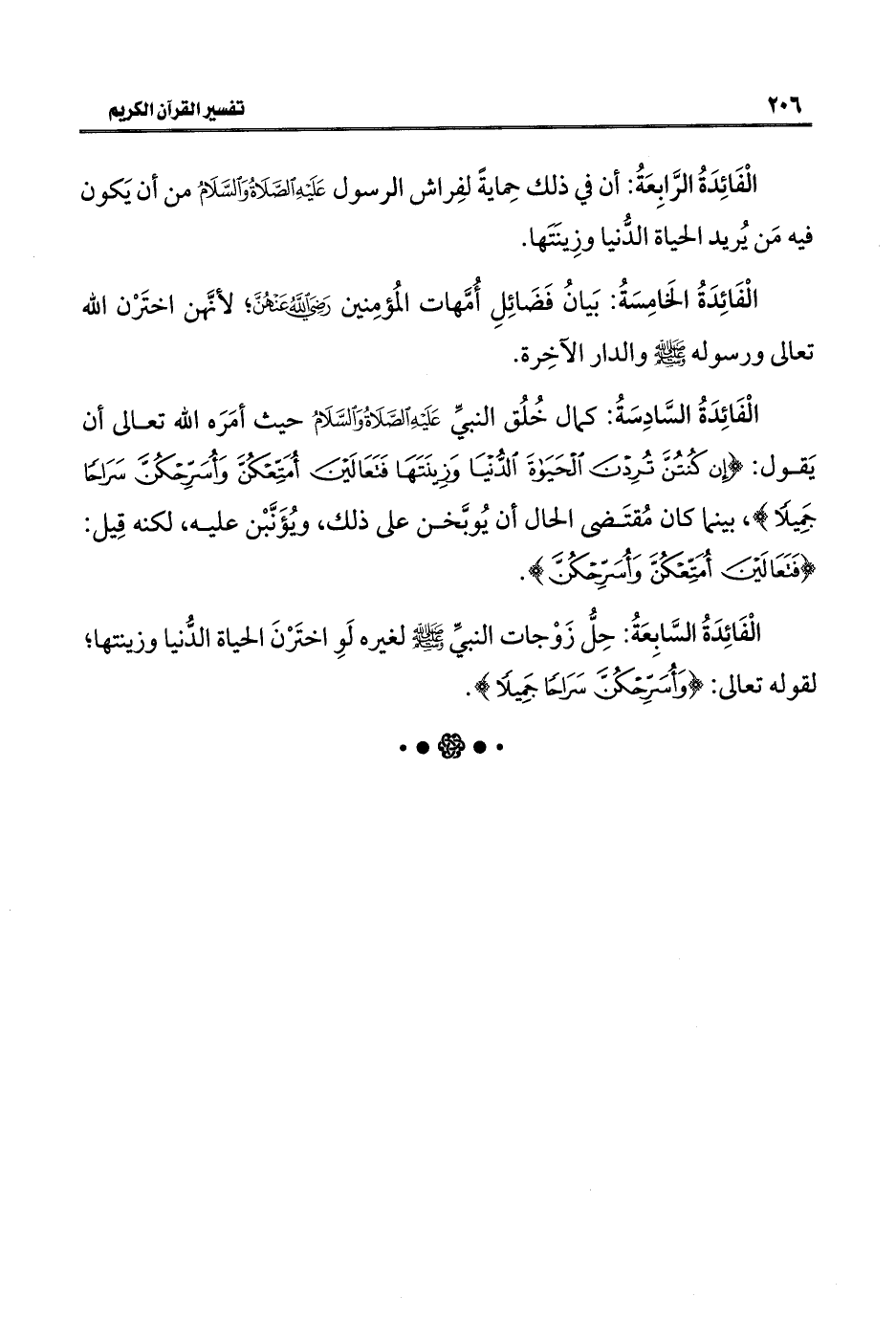 الْفَائِدَةُ السادِسَةُ: كمال خُلُق النبي عَلَيْهِ الصَّلَاةُ وَالسَّلَامُ حيث أمَرَه اللَّه تعالى أن يَقول: {إِنْ كُنْتُنَّ تُرِدْنَ الْحَيَاةَ الدُّنْيَا وَزِينَتَهَا فَتَعَالَيْنَ أُمَتِّعْكُنَّ وَأُسَرِّحْكُنَّ سَرَاحًا جَمِيلًا}، بينما كان مُقتَضى الحال أن يُوبَّخن على ذلك، ويُؤَنَّبْن عليه، لكنه قِيل: {فَتَعَالَيْنَ أُمَتِّعْكُنَّ وَأُسَرِّحْكُنَّ}.