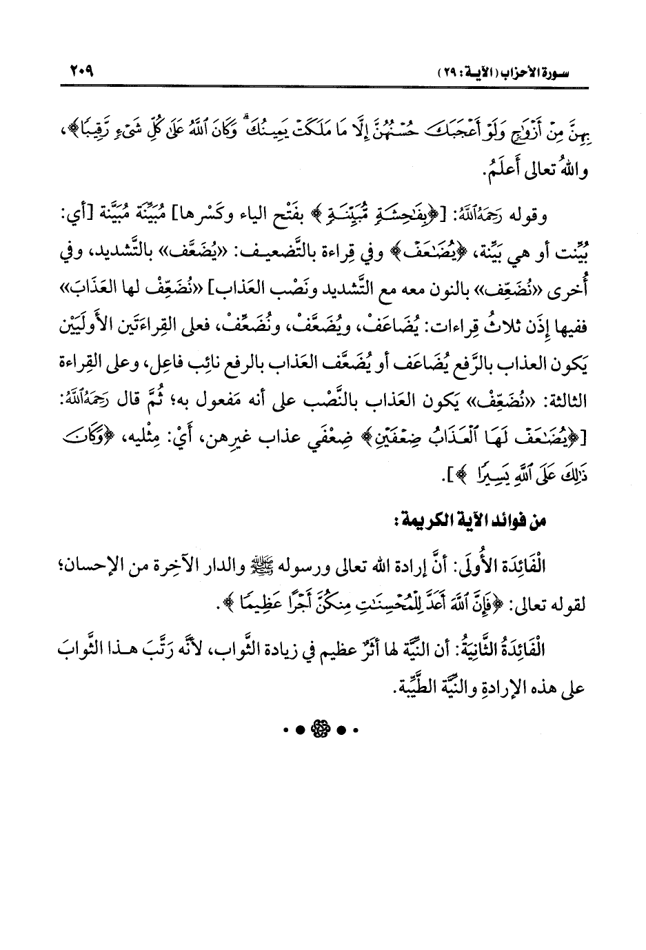 وقوله رَحِمَهُ اللَّهُ: [{بِفَاحِشَةٍ مُبَيِّنَةٍ} بفَتْح الياء وكَسْرها] مُبَيِّنَة مُبَيَّنة [أي: بُيِّنت أو هي بَيِّنة، {يُضَاعَفْ} وفي قِراءة بالتَّضعيف: "يُضَعَّف" بالتَّشديد، وفي أُخرى "نُضَعِّف" بالنون معه مع التَّشديد ونَصْب العَذاب] "نُضَعِّفْ لها العَذَابَ" ففيها إِذَن ثلاثُ قِراءات: يُضَاعَفْ، ويُضَعَّفْ، ونُضَعِّفْ، فعلى القِراءَتَين الأَولَيَيْن يَكون العذاب بالرَّفع يُضَاعَف أو يُضَعَّف العَذاب بالرفع نائِب فاعِل، وعلى القِراءة الثالثة: "نُضَعِّفْ" يَكون العَذاب بالنَّصْب على أنه مَفعول به، ثُمَّ قال رَحِمَهُ اللَّهُ: [{يُضَاعَفْ لَهَا الْعَذَابُ ضِعْفَيْنِ} ضِعْفَي عذاب غيرِهن، أَيْ: مِثْليه، {وَكَانَ ذَلِكَ عَلَى اللَّهِ يَسِيرًا}].