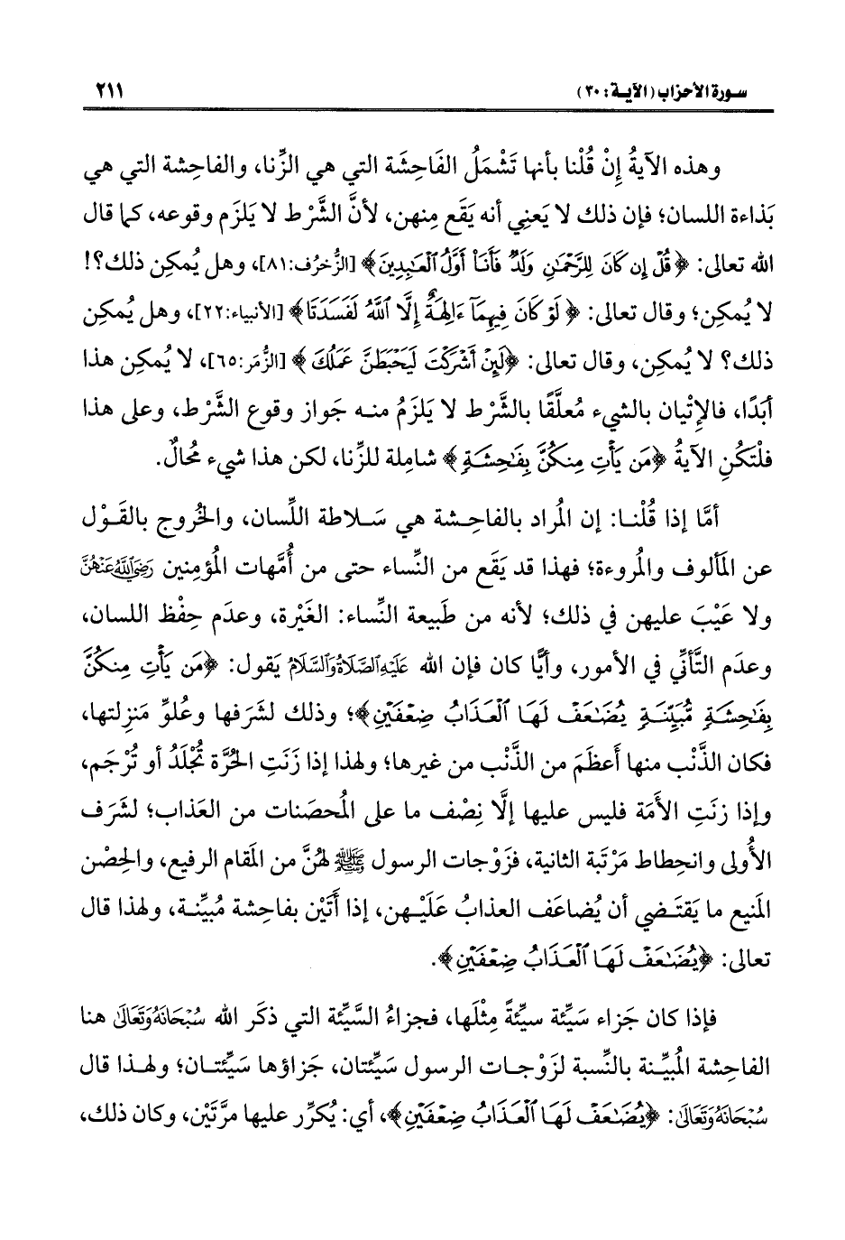 وهذه الآيةُ إِنْ قُلْنا بأنها تَشْمَلُ الفَاحِشَة التي هي الزِّنا، والفاحِشة التي هي بَذاءة اللسان؛ فإن ذلك لا يَعنِي أنه يَقَع مِنهن، لأنَّ الشَّرْط لا يَلزَم وقوعه، كما قال اللَّه تعالى: {قُلْ إِنْ كَانَ لِلرَّحْمَنِ وَلَدٌ فَأَنَا أَوَّلُ الْعَابِدِينَ} [الزخرف: ٨١]، وهل يُمكِن ذلك؟ ! لا يُمكِن؛ وقال تعالى: {لَوْ كَانَ فِيهِمَا آلِهَةٌ إِلَّا اللَّهُ لَفَسَدَتَا} [الأنبياء: ٢٢]، وهل يُمكِن ذلك؟ لا يُمكِن، وقال تعالى: {لَئِنْ أَشْرَكْتَ لَيَحْبَطَنَّ عَمَلُكَ} [الزُمَر: ٦٥]، لا يُمكِن هذا أبدًا، فالإِتْيان بالشيء مُعلَّقًا بالشَّرْط لا يَلزَمُ منه جَواز وقوع الشَّرْط، وعلى هذا فلْتكُنِ الآيةُ {مَنْ يَأْتِ مِنْكُنَّ بِفَاحِشَةٍ} شامِلة للزِّنا، لكن هذا شيء محُالٌ.