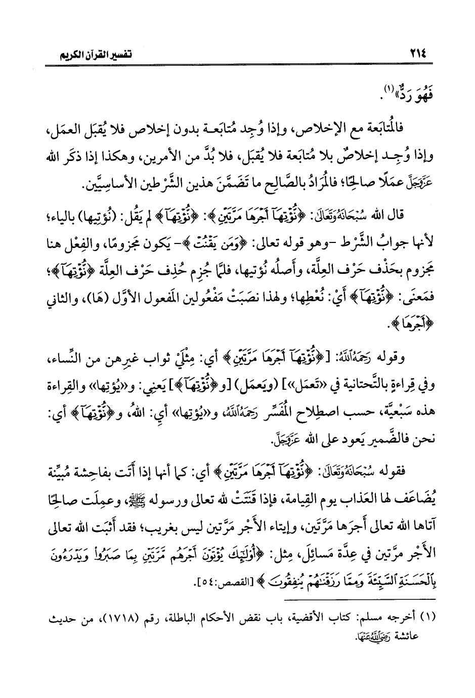 قال اللَّه سُبْحَانَهُ وَتَعَالَى: {نُؤْتِهَا أَجْرَهَا مَرَّتَيْنِ}: {نُؤْتِهَا} لم يَقُل: (نُؤتِيها) بالياء؛ لأنها جوابُ الشَّرْط -وهو قوله تعالى: {وَمَنْ يَقْنُتْ} - يَكون مجَزومًا، والفِعْل هنا مجَزوم بحَذْف حَرْف العِلَّة، وأَصلُه نُؤتيها، فلمَّا جُزِم حُذِف حَرْف العِلَّة {نُؤْتِهَا}؛ فمَعنَى: {نُؤْتِهَا} أَيْ: نُعْطِها؛ ولهذا نصَبَتْ مَفْعُولين المَفعول الأوَّل (هَا)، والثاني {أَجْرَهَا}.