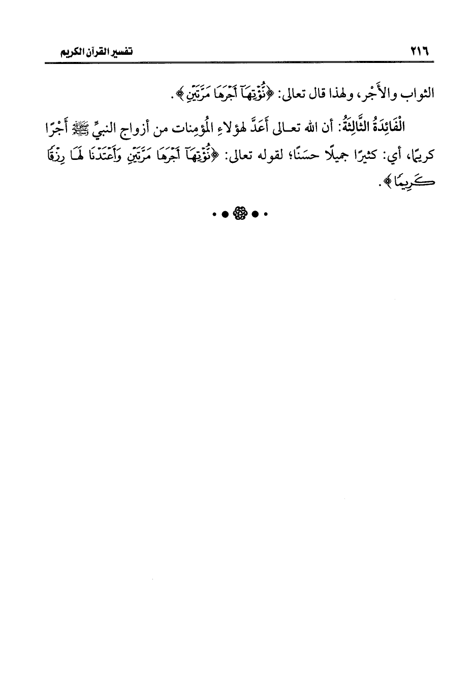 الْفَائِدَةُ الثَّالِثَةُ: أن اللَّه تعالى أَعَدَّ لهؤلاءِ المُؤمِنات من أزواج النبيِّ -صلى اللَّه عليه وسلم- أَجْرًا كريمًا، أي: كثيرًا جميلًا حسَنًا؛ لقوله تعالى: {نُؤْتِهَا أَجْرَهَا مَرَّتَيْنِ وَأَعْتَدْنَا لَهَا رِزْقًا كَرِيمًا}.