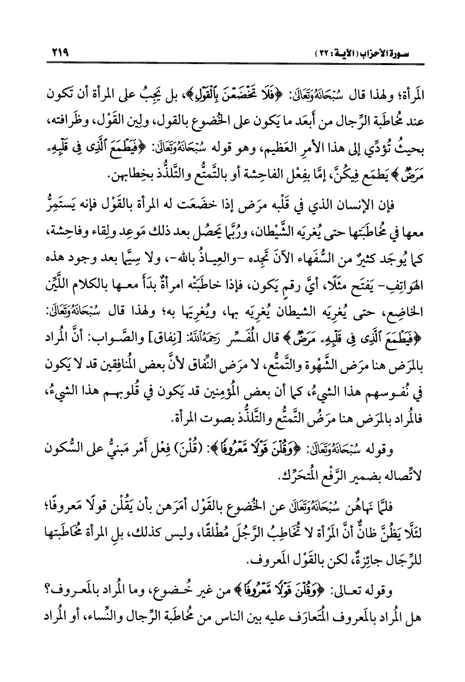 المَرأة، ولهذا قال سُبْحَانَهُ وَتَعَالَى: {فَلَا تَخْضَعْنَ بِالْقَوْلِ}، بل يَجِبُ على المرأة أن تَكون عند مخُاطَبة الرِّجال من أَبعَد ما يَكون على الخُضوع بالقول، ولين القَوْل، وظَرافته، بحيثُ تُؤدِّي إلى هذا الأمرِ العَظيم، وهو قوله سُبْحَانَهُ وَتَعَالَى: {فَيَطْمَعَ الَّذِي فِي قَلْبِهِ مَرَضٌ} يَطمَع فِيكُنَّ، إمَّا بفِعْل الفاحِشة أو بالتَّمتُّع والتَّلذُّذ بخِطابهن.
