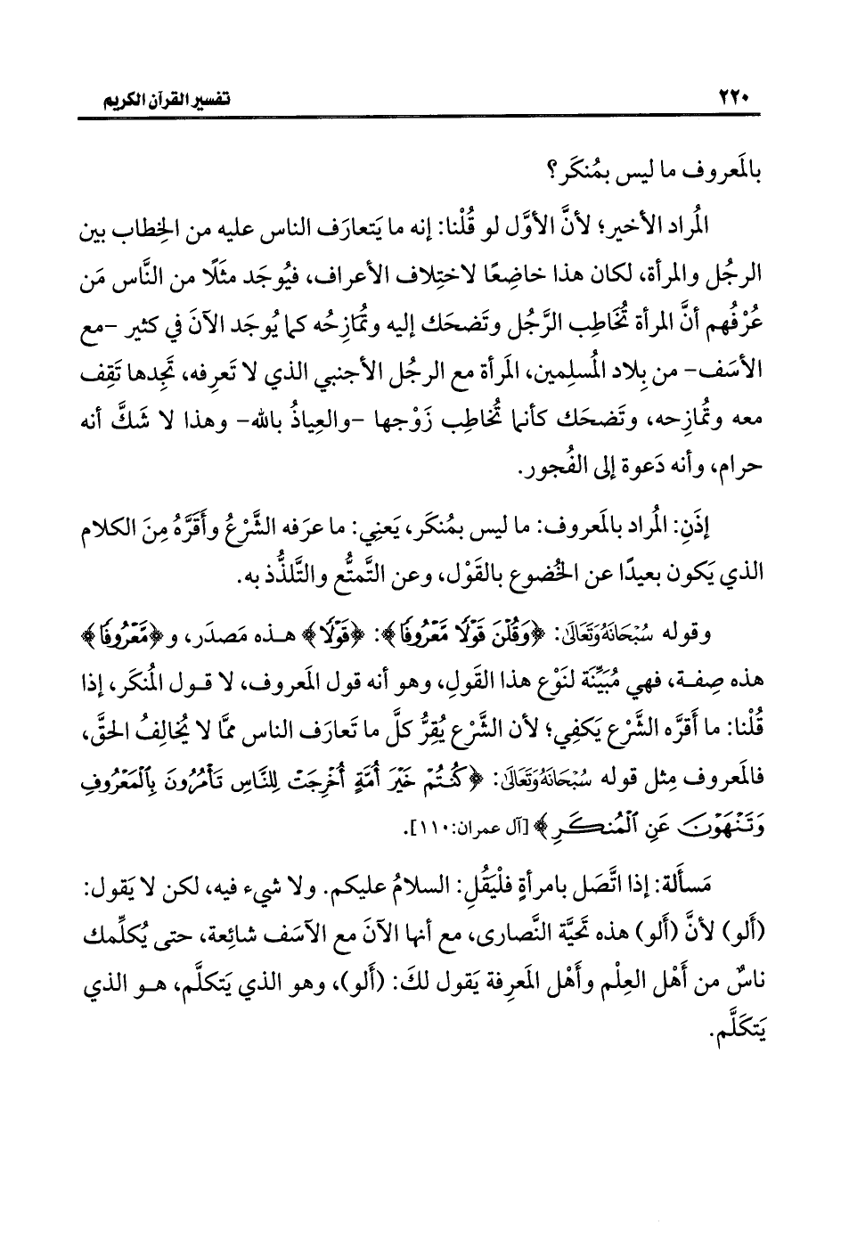 وقوله سُبْحَانَهُ وَتَعَالَى: {وَقُلْنَ قَوْلًا مَعْرُوفًا}: {قَوْلًا}، هذه مَصدَر، و {مَعْرُوفًا} هذه صِفة، فهي مُبَيِّنَة لنَوْع هذا القَولِ، وهو أنه قول المَعروف، لا قول المُنكَر، إذا قُلْنا: ما أَقرَّه الشَّرْع يَكفِي؛ لأن الشَّرْع يُقِرُّ كلَّ ما تَعارَف الناس ممَّا لا يُخالِفُ الحقَّ، فالمَعروف مِثل قوله سُبْحَانَهُ وَتَعَالَى: {كُنْتُمْ خَيْرَ أُمَّةٍ أُخْرِجَتْ لِلنَّاسِ تَأْمُرُونَ بِالْمَعْرُوفِ وَتَنْهَوْنَ عَنِ الْمُنْكَرِ} [آل عمران: ١١٠].