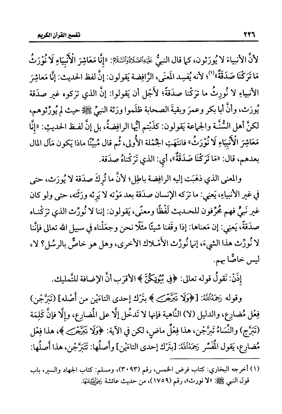 (¬١) أخرجه البخاري: كتاب فرض الخمس، رقم (٣٠٩٣)، ومسلم: كتاب الجهاد والسير، باب قول النبي -صلى اللَّه عليه وسلم-: "لا نورث"، رقم (١٧٥٩)، من حديث عائشة -رضي اللَّه عنها-.