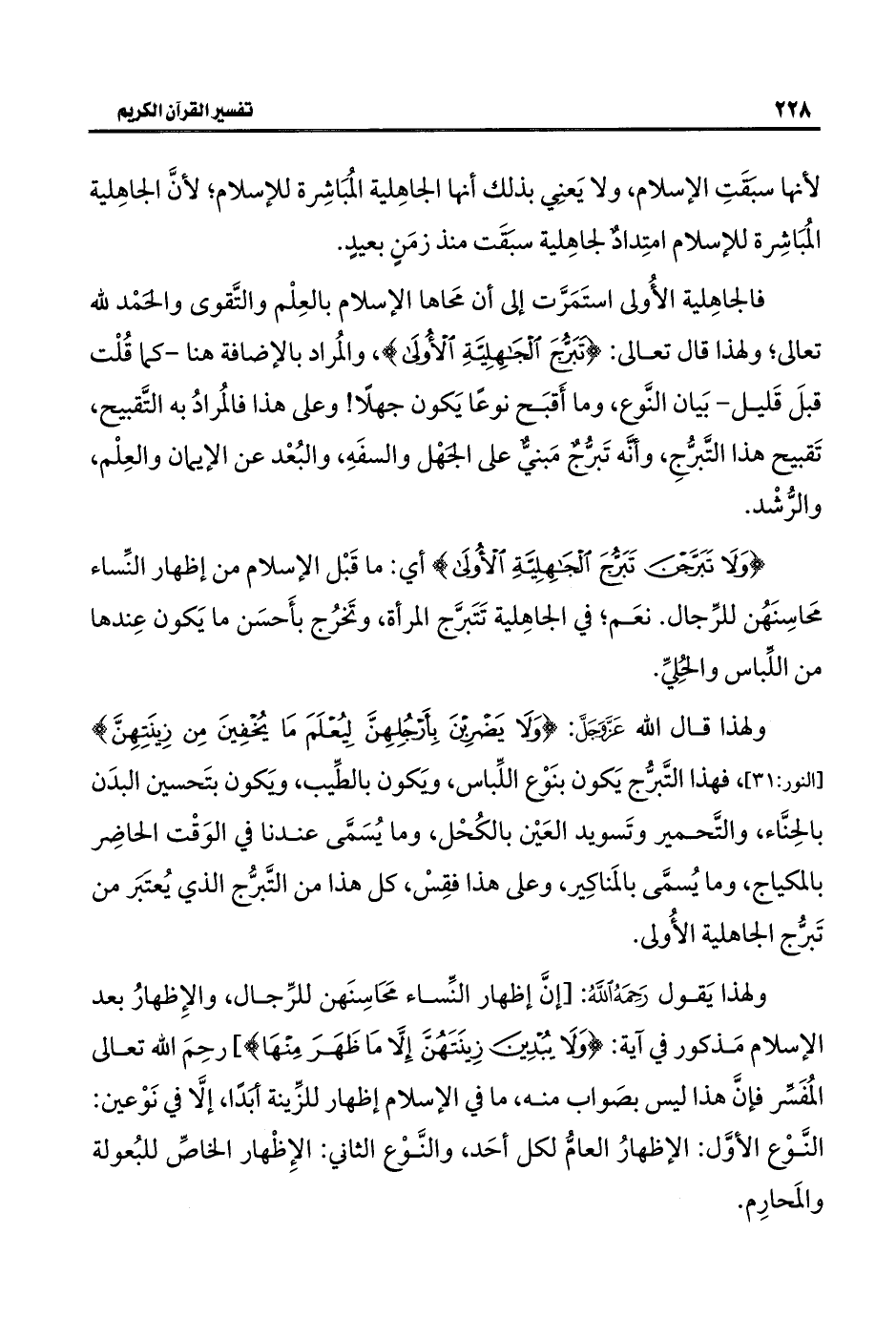 ولهذا يَقول رَحِمَهُ اللَّهُ: [إنَّ إظهار النِّساء مَحَاسِنَهن للرِّجال، والإِظهارُ بعد الإسلام مَذكور في آية: {وَلَا يُبْدِينَ زِينَتَهُنَّ إِلَّا مَا ظَهَرَ مِنْهَا}، رحِمَ اللَّه تعالى المُفَسِّر فإنَّ هذا ليس بصَواب منه، ما في الإسلام إظهار للزِّينة أبدًا، إلَّا في نَوْعين: النَّوْع الأوَّل: الإظهارُ العامُّ لكل أحَد، والنَّوْع الثاني: الإِظْهار الخاصِّ للبُعولة والمَحارِم.