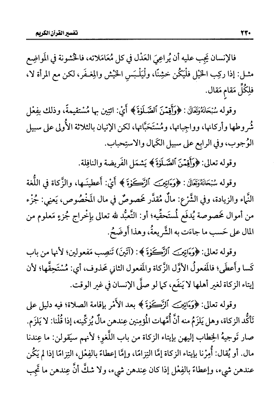 وقوله سُبْحَانَهُ وَتَعَالَى: {وَأَقِمْنَ الصَّلَاةَ} أَيْ: ائتِين بها مُسْتقيمةً، وذلك بفِعْل شُروطها وأركانها، وواجِباتها، ومُسْتَحَبَّاتها، لكن الإتيان بالثلاثة الأُولى على سبيل الوُجوب، وفي الرابع على سبيل الكَمال والاستِحباب.