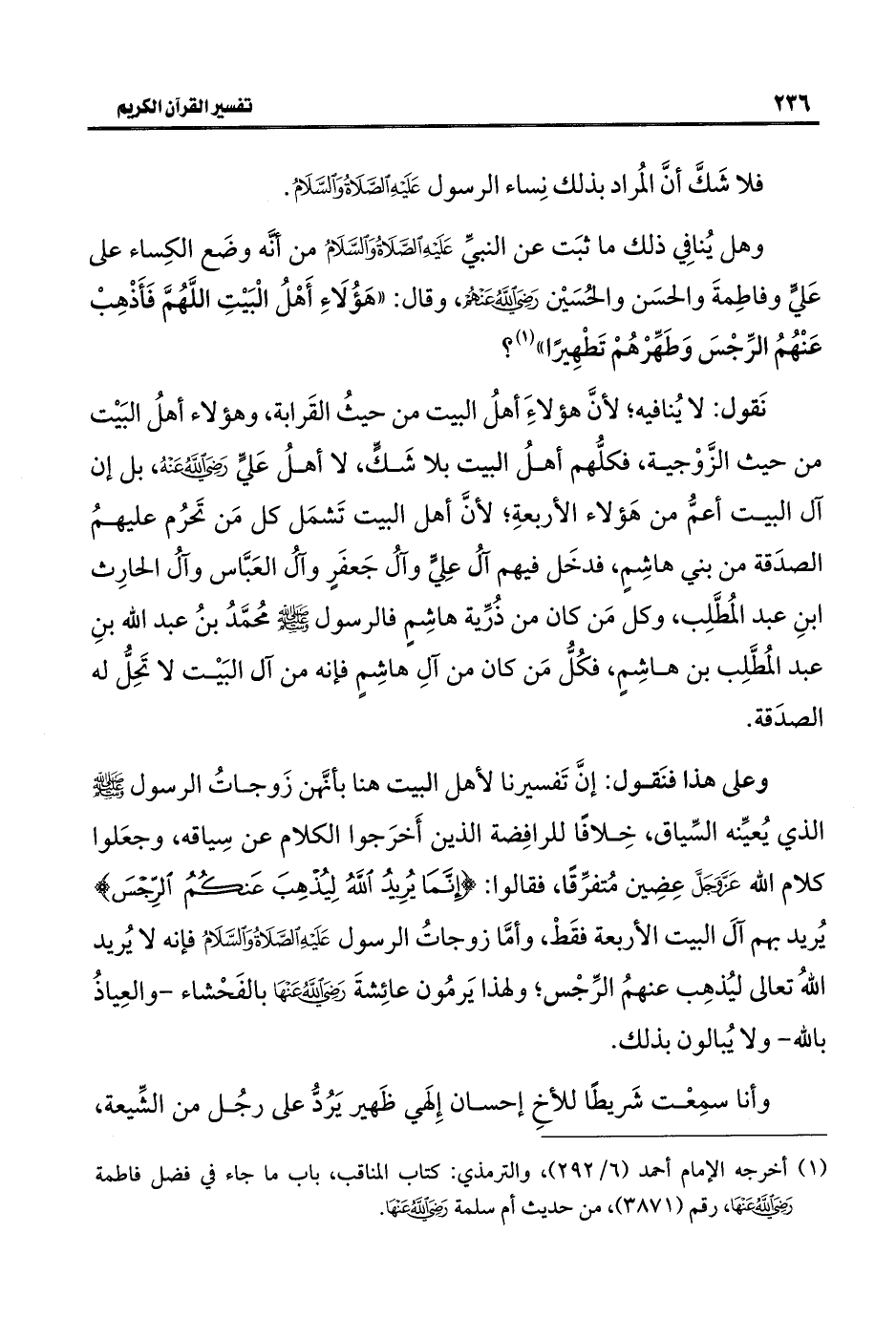 وعلى هذا فنَقول: إنَّ تَفسيرنا لأهل البيت هنا بأنَّهن زَوجاتُ الرسول -صلى اللَّه عليه وسلم- الذي يُعيِّنه السِّياق، خِلافًا للرافِضة الذين أَخرَجوا الكلام عن سِياقه، وجعَلوا كلام اللَّه عَزَّ وَجَلَّ عِضِين مُتفرِّقًا، فقالوا: {إِنَّمَا يُرِيدُ اللَّهُ لِيُذْهِبَ عَنْكُمُ الرِّجْسَ} يُريد بهم آلَ البيت الأربعة فقَطْ، وأمَّا زوجاتُ الرسول عَلَيْهِ الصَّلَاةُ وَالسَّلَامُ فإنه لا يُريد اللَّهُ تعالى ليُذهِب عنهمُ الرِّجْس؛ ولهذا يَرمُون عائِشةَ -رضي اللَّه عنها- بالفَحْشاء -والعِياذُ باللَّه- ولا يُبالون بذلك.