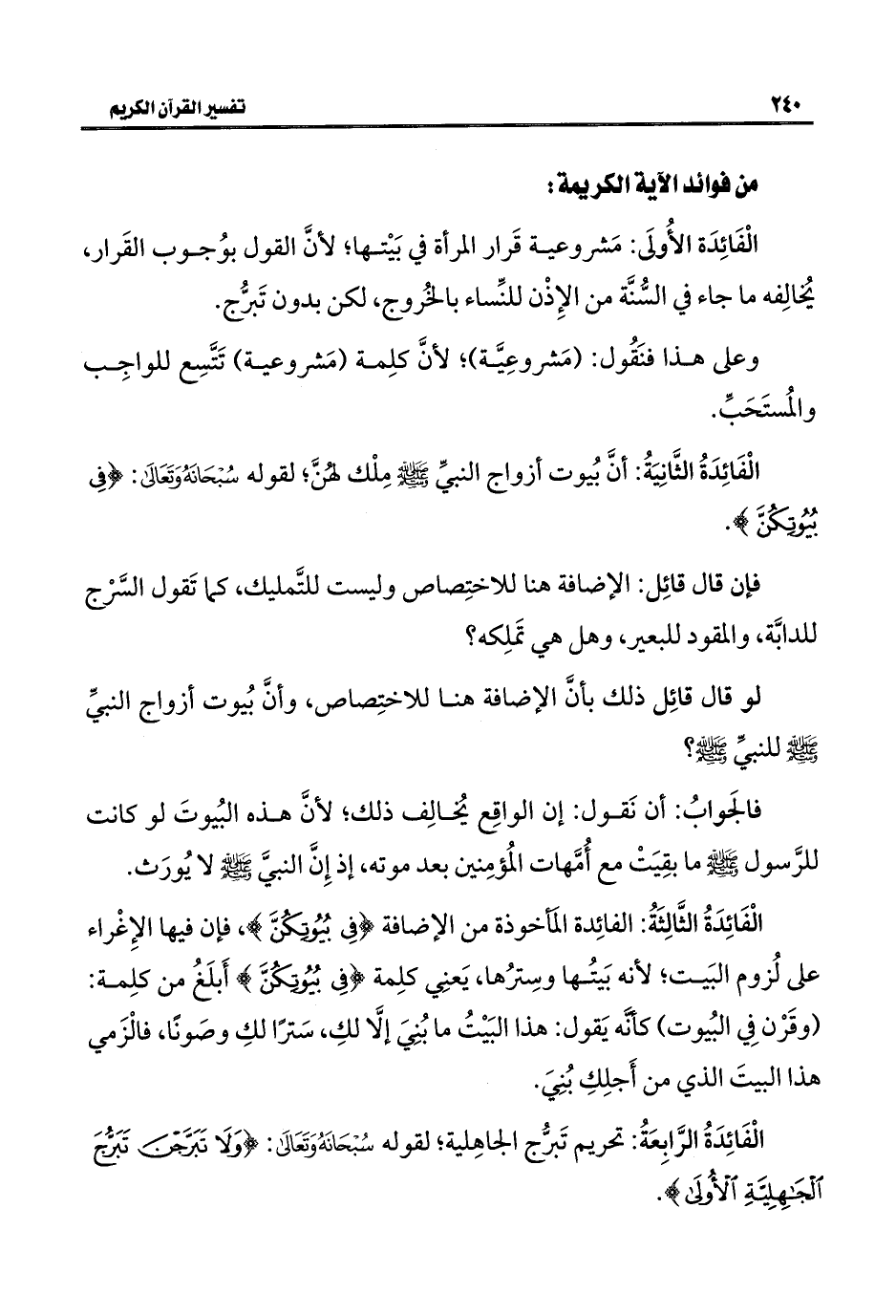 الْفَائِدَةُ الثَّالِثَةُ: الفائِدة المَأخوذة من الإضافة {فِي بُيُوتِكُنَّ}، فإن فيها الإِغْراء على لُزوم البَيت؛ لأنه بَيتُها وسِترُها، يَعنِي كلِمة {فِي بُيُوتِكُنَّ} أَبلَغُ من كلِمة: (وقَرْن فِي البُيوت) كأنَّه يَقول: هذا البَيْتُ ما بُنِيَ إلَّا لكِ، سَترًا لكِ وصَونًا، فالْزَمي هذا البيتَ الذي من أَجلِكِ بُنِيَ.