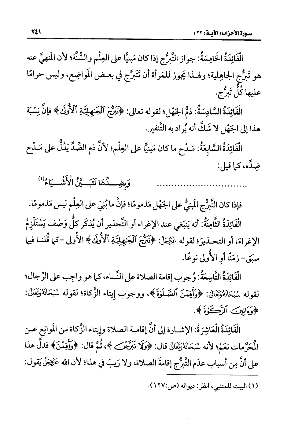 الْفَائِدَةُ الخَامِسَةُ: جواز التَّبرُّج إذا كان مَبنيًّا على العِلْم والسُّنَّة؛ لأن المَنهيَّ عنه هو تَبرُّج الجاهِلية؛ ولهذا يَجوز للمَرأة أن تَتَبرَّج في بعض المَواضِع، وليس حرامًا عليها كُلُّ تَبرُّج.