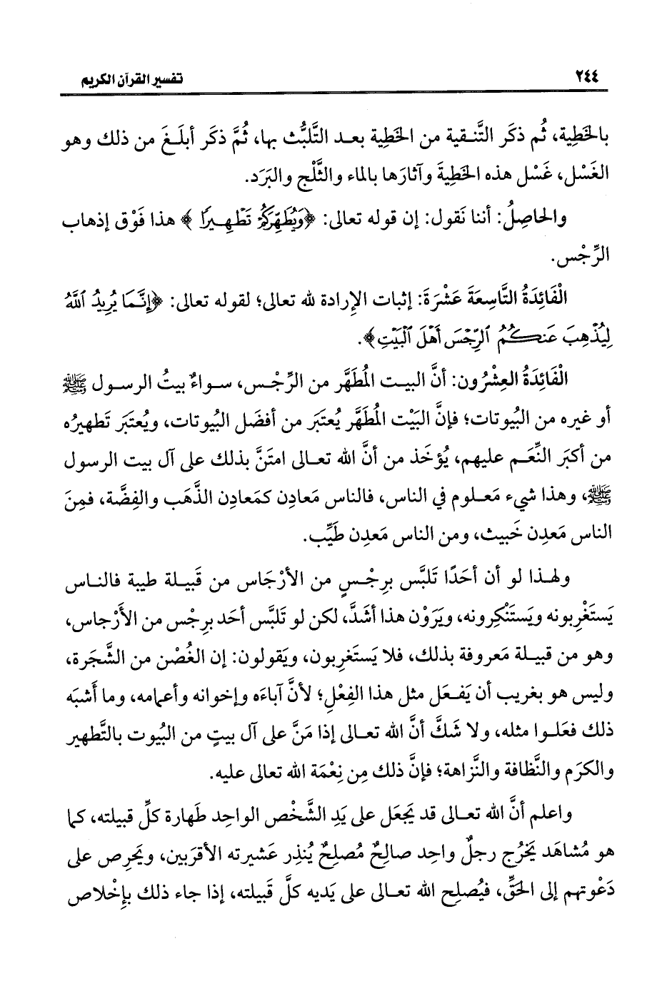 الْفَائِدَةُ التَّاسِعَةَ عَشْرَةَ: إثبات الإِرادة للَّه تعالى؛ لقوله تعالى: {إِنَّمَا يُرِيدُ اللَّهُ لِيُذْهِبَ عَنْكُمُ الرِّجْسَ أَهْلَ الْبَيْتِ}.