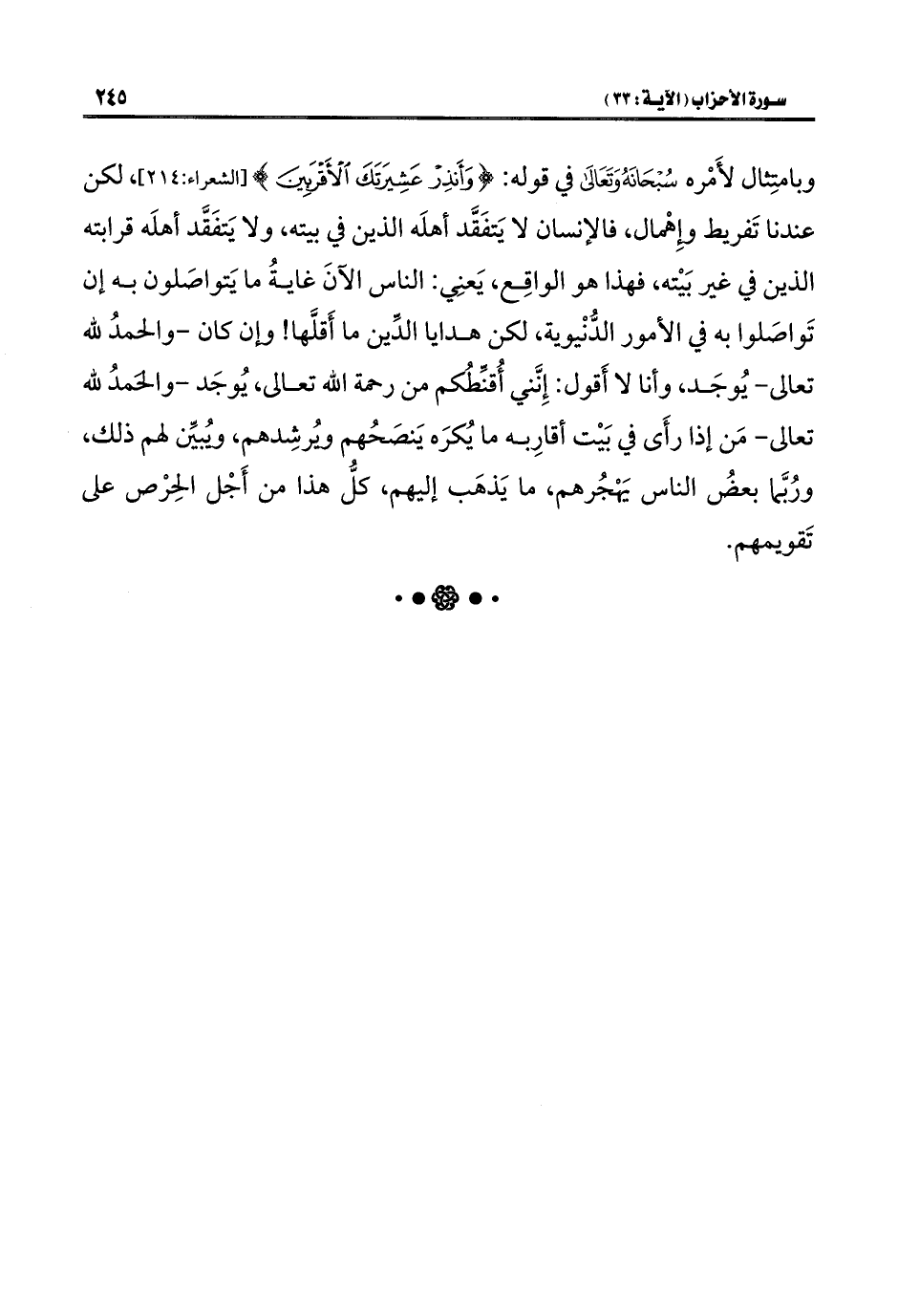 وبامتِثال لأَمْره سُبْحَانَهُ وَتَعَالَى في قوله: {وَأَنْذِرْ عَشِيرَتَكَ الْأَقْرَبِينَ} [الشعراء: ٢١٤]، لكن عندنا تَفريط وإِهْمال، فالإنسان لا يَتفَقَّد أهلَه الذين في بيته، ولا يَتفَقَّد أهلَه قرابته الذين في غير بَيْته، فهذا هو الواقِع، يَعنِي: الناس الآنَ غايةُ ما يَتواصَلون به إن تَواصَلوا به في الأمور الدُّنْيوية، لكن هدايا الدِّين ما أَقلَّها! وإن كان -والحمدُ للَّه تعالى- يُوجَد، وأنا لا أَقول: إِنَّني أُقنِّطُكم من رحمة اللَّه تعالى، يُوجَد -والحمدُ للَّه تعالى- مَن إذا رأَى في بَيْت أقارِبه ما يُكرَه يَنصَحُهم ويُرشِدهم، ويُبيِّن لهم ذلك، ورُبَّما بعضُ الناس يَهْجُرهم، ما يَذهَب إليهم، كلُّ هذا من أَجْل الحِرْص على تَقويمهم.